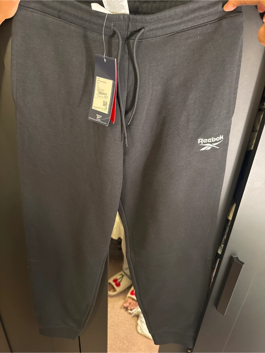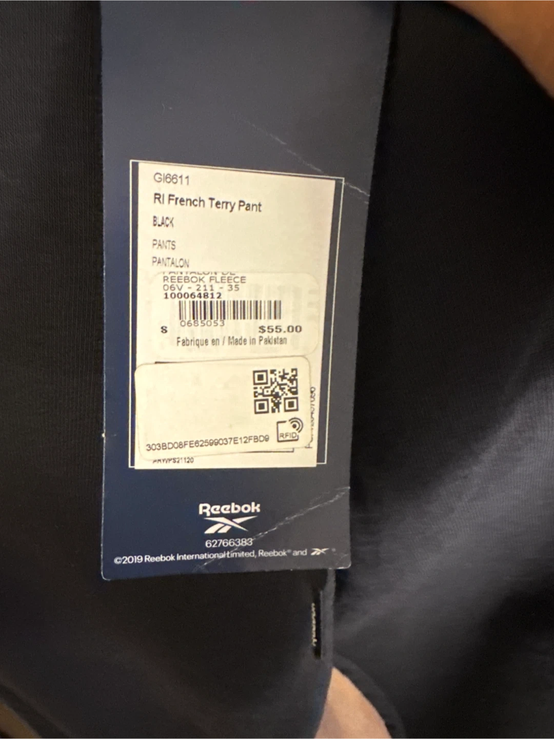 These are black Reebok RI French Terry Pants in size small. They're made from French terry material. These pants are good for casual wear or exercise.