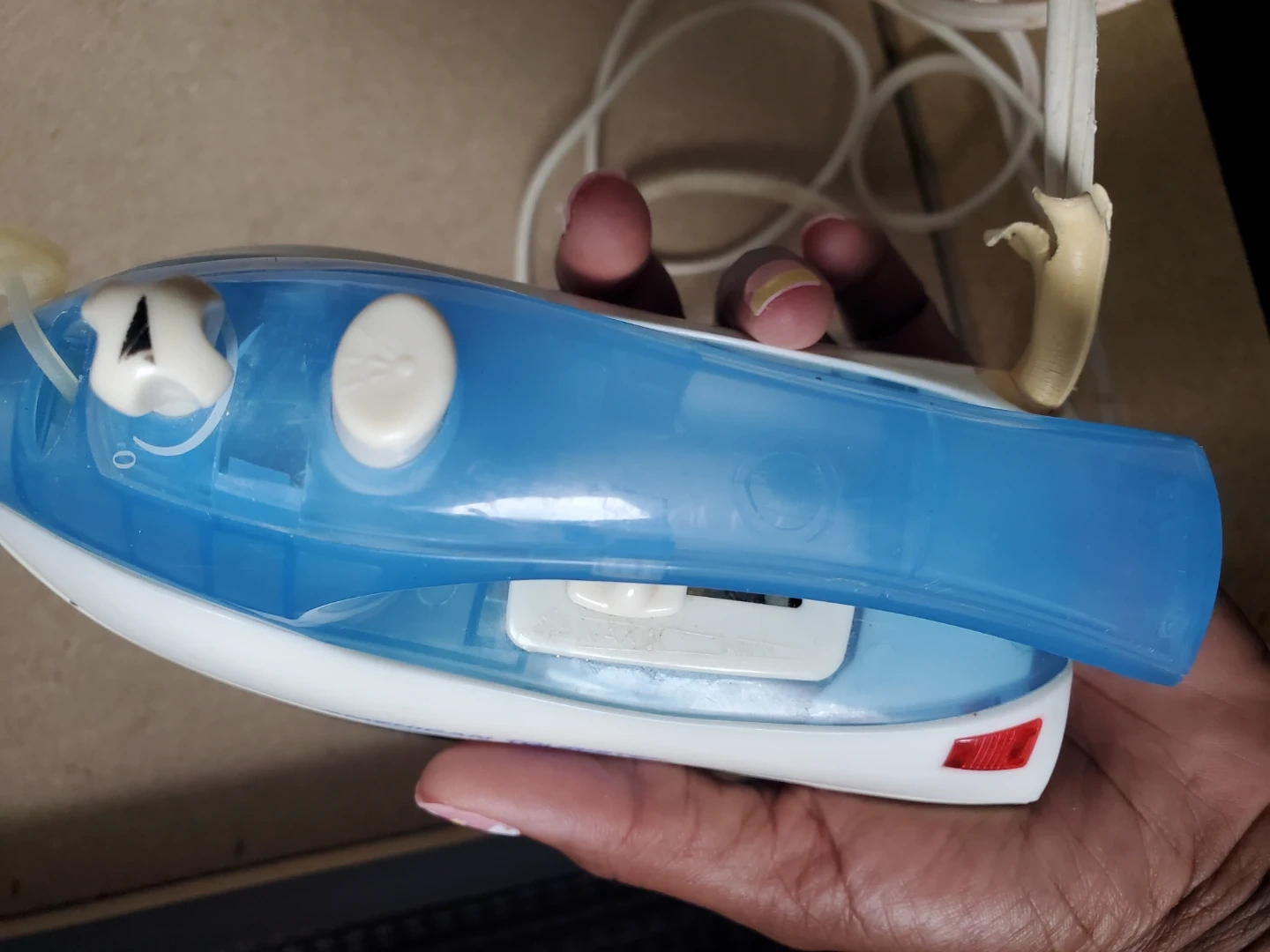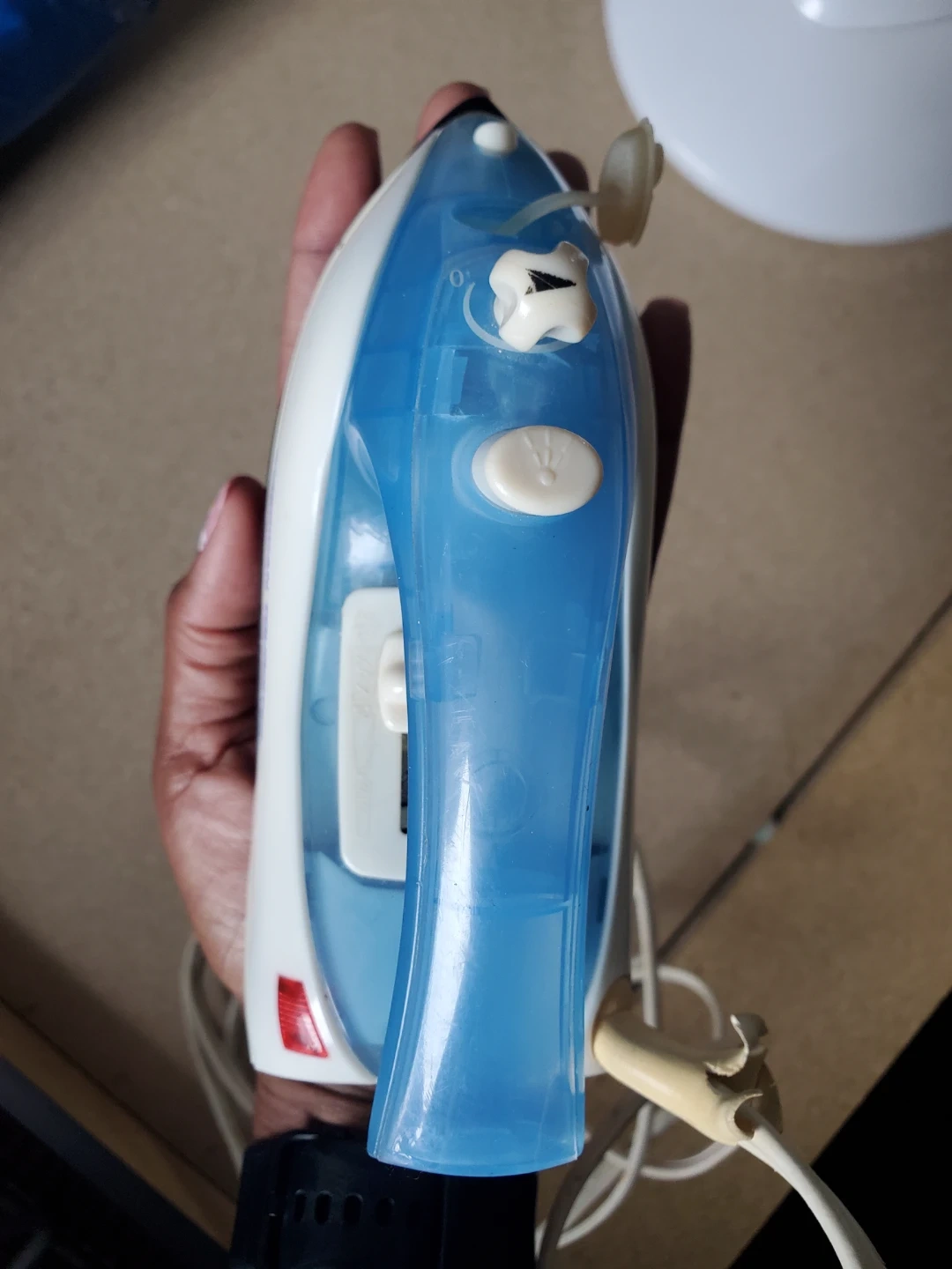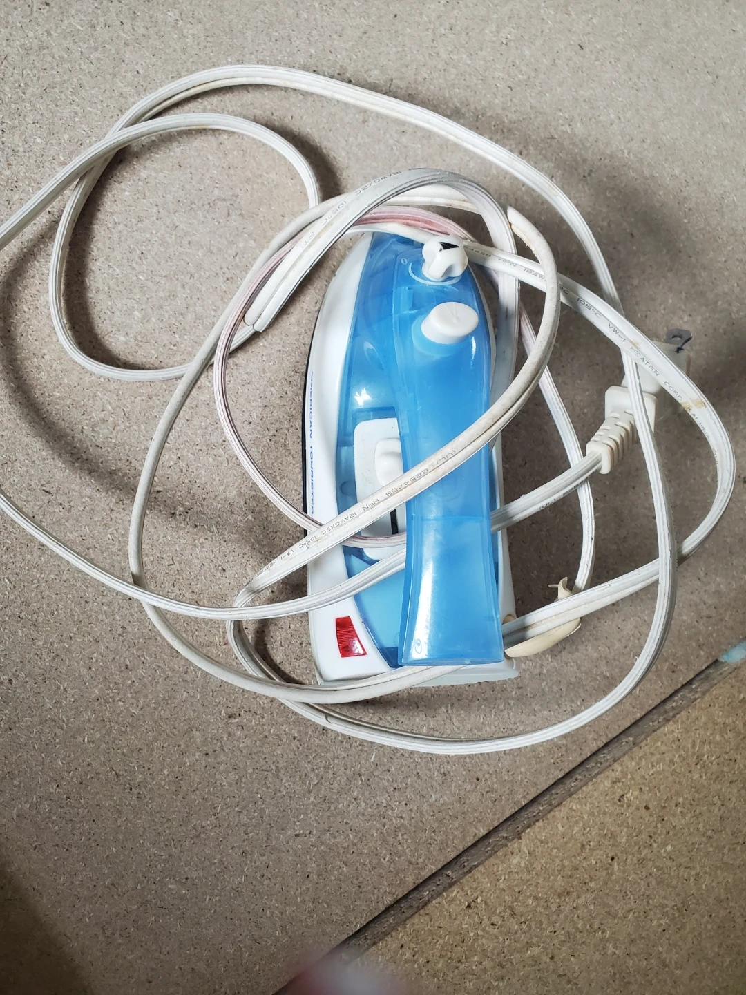 This is a compact travel iron from Touristers. It features a blue and white design and includes a power cord. Its small size makes it convenient for packing. Perfect for touch-ups on the go!