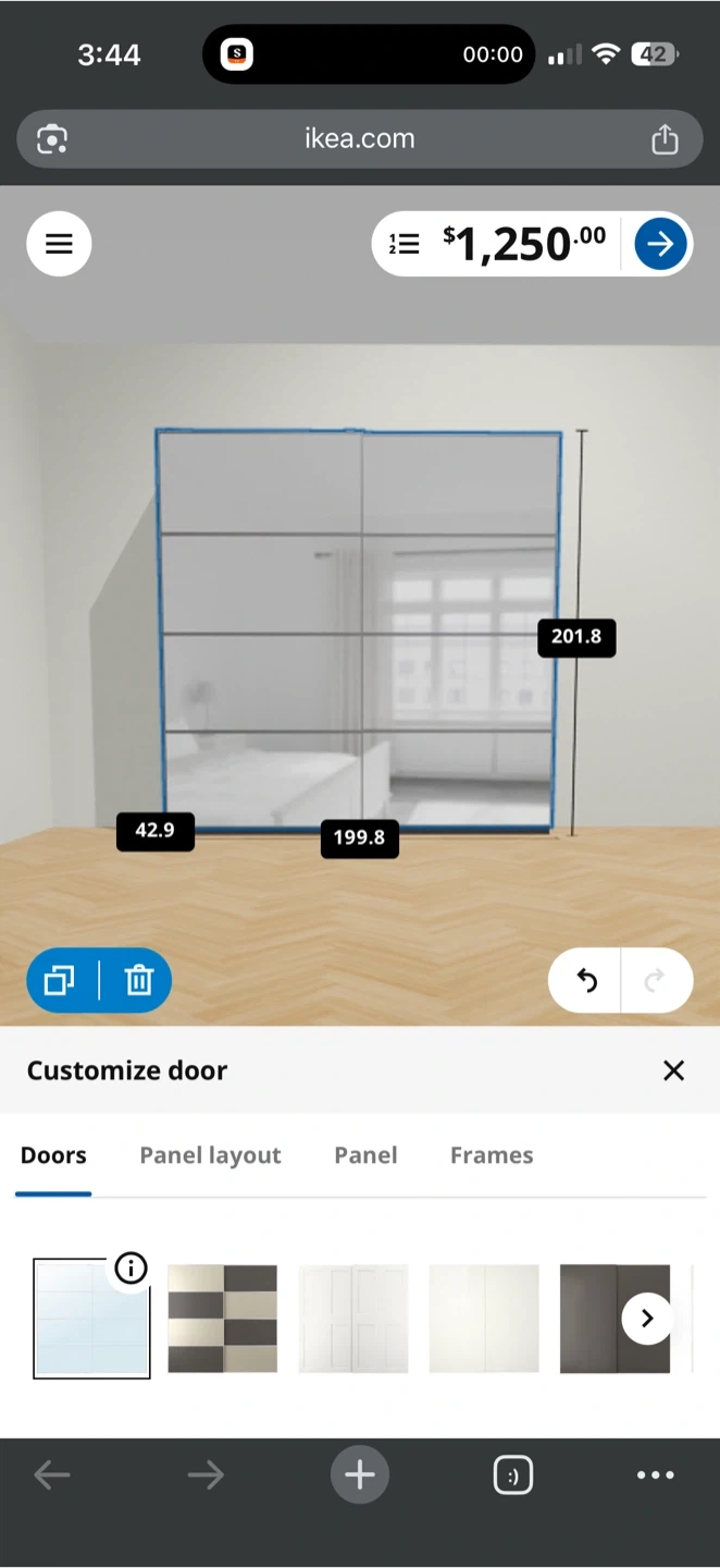 Dark gray wardrobe frame. It's 201.8 cm high, 199.8 cm wide, and 42.9 cm deep. Perfect for organizing your clothes!