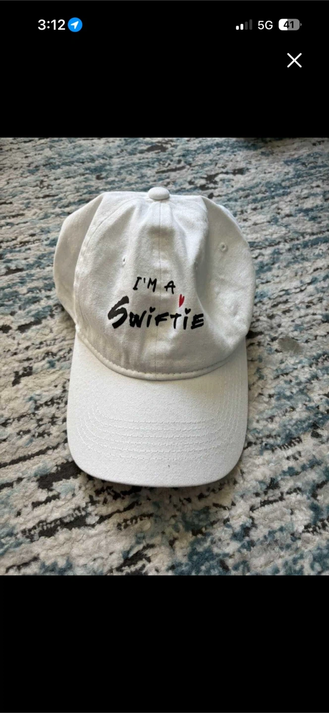 White baseball cap with "I'm a Swiftie" embroidered on the front. It's a simple cap for any Taylor Swift fan. This cap is a one-size-fits-most style.