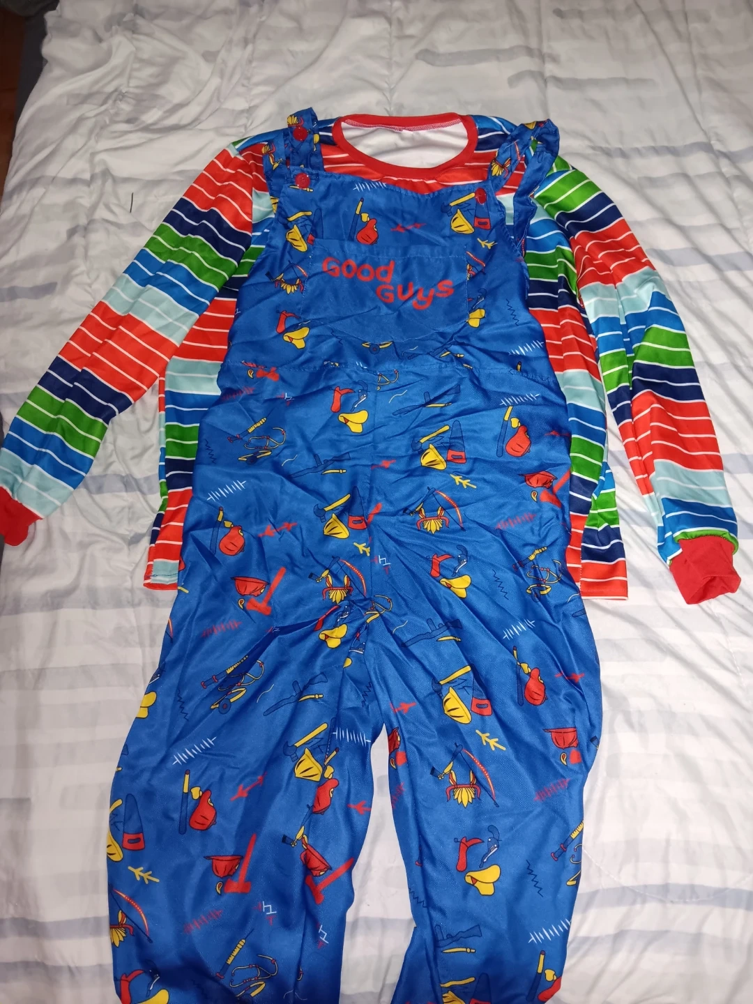 Here's a fun chuckys mens halloween costume ! It features a blue overall-style top with a 'Good Guys' logo and a long-sleeved striped shirt