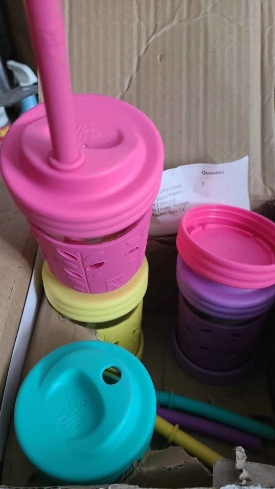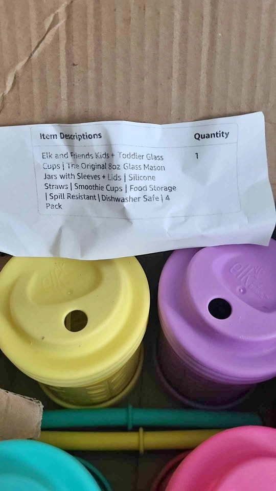 BRAND NEW!!! NEVER USED ELK AND FRIENDS KIDS TODDLER 8OZ GLASS MASON JARS WITH SLEEVES +LIDS SILICONE STRAWS SMOOTHIE CUPS FOOD STORAGE SPILL RESISTANT DISHWASHER SAFE 4PACK. IN BOX DAMAGED BOX BUT PRODUCT IS ALL NEW. PICK UP NEWCASTLE.