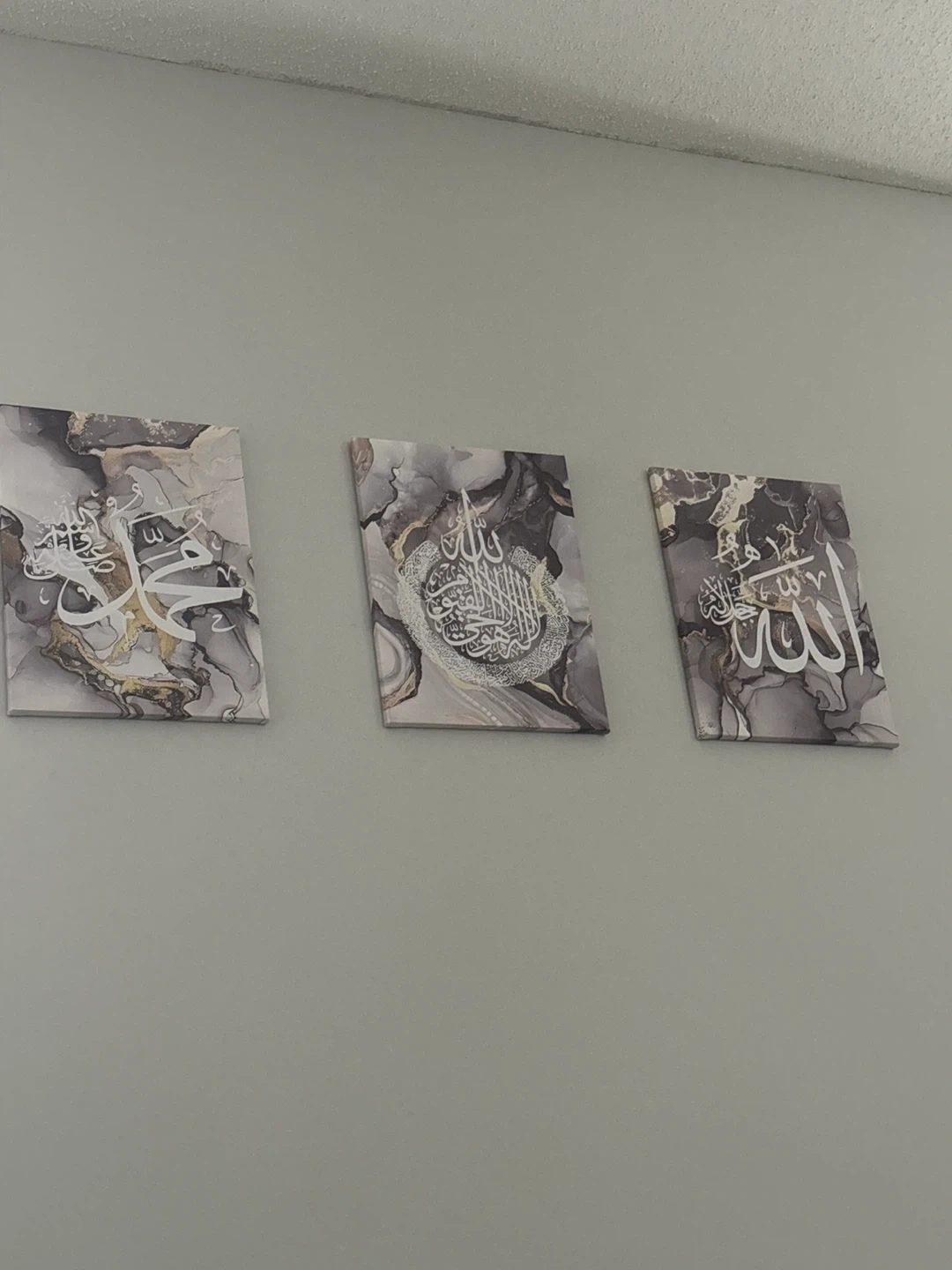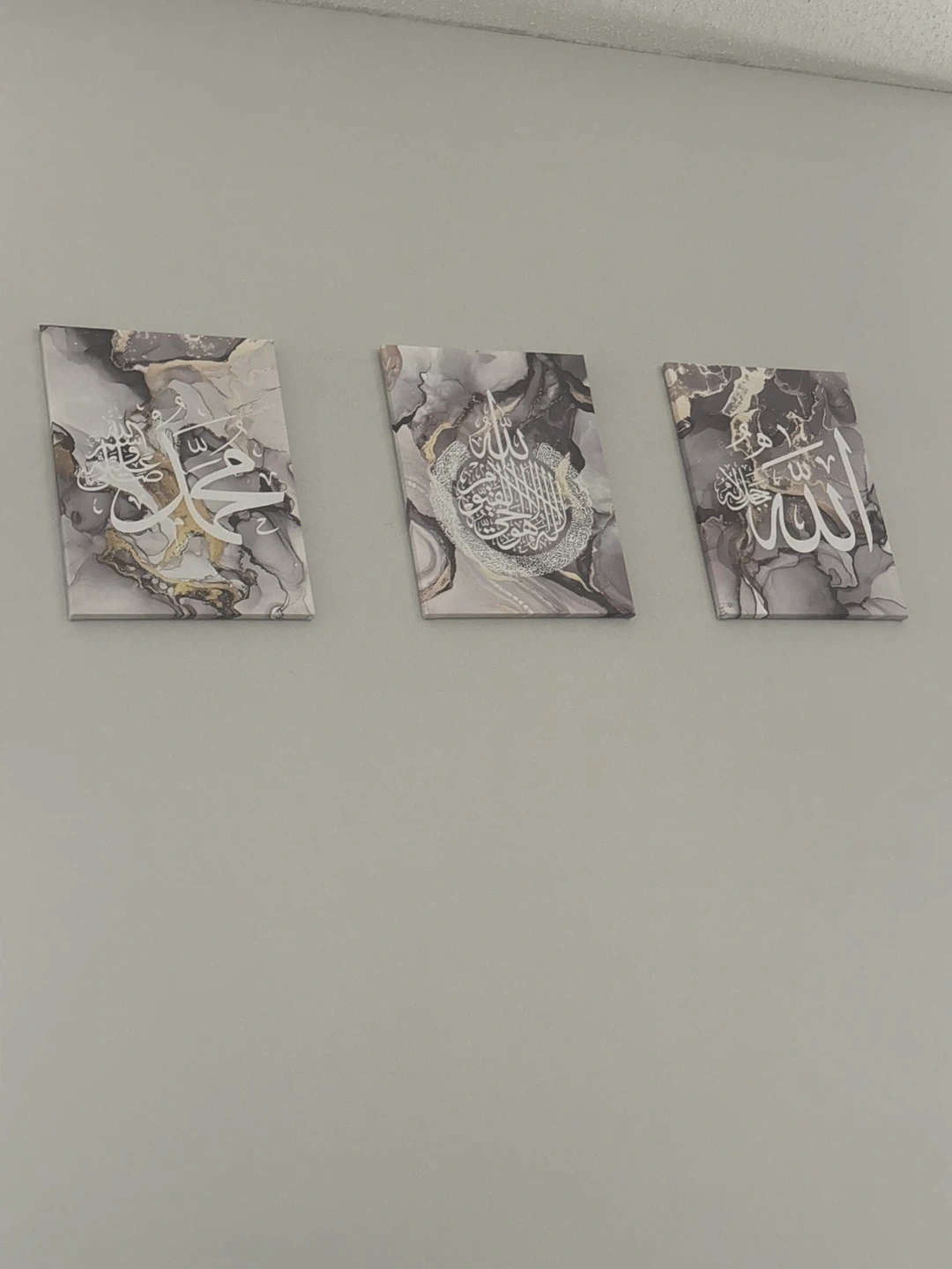A set of three canvas prints featuring Islamic calligraphy and a marble-like design. These pieces add a touch of elegance to any room. Perfect for adding a spiritual and artistic element to your home décor.
