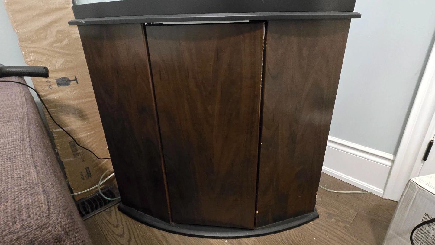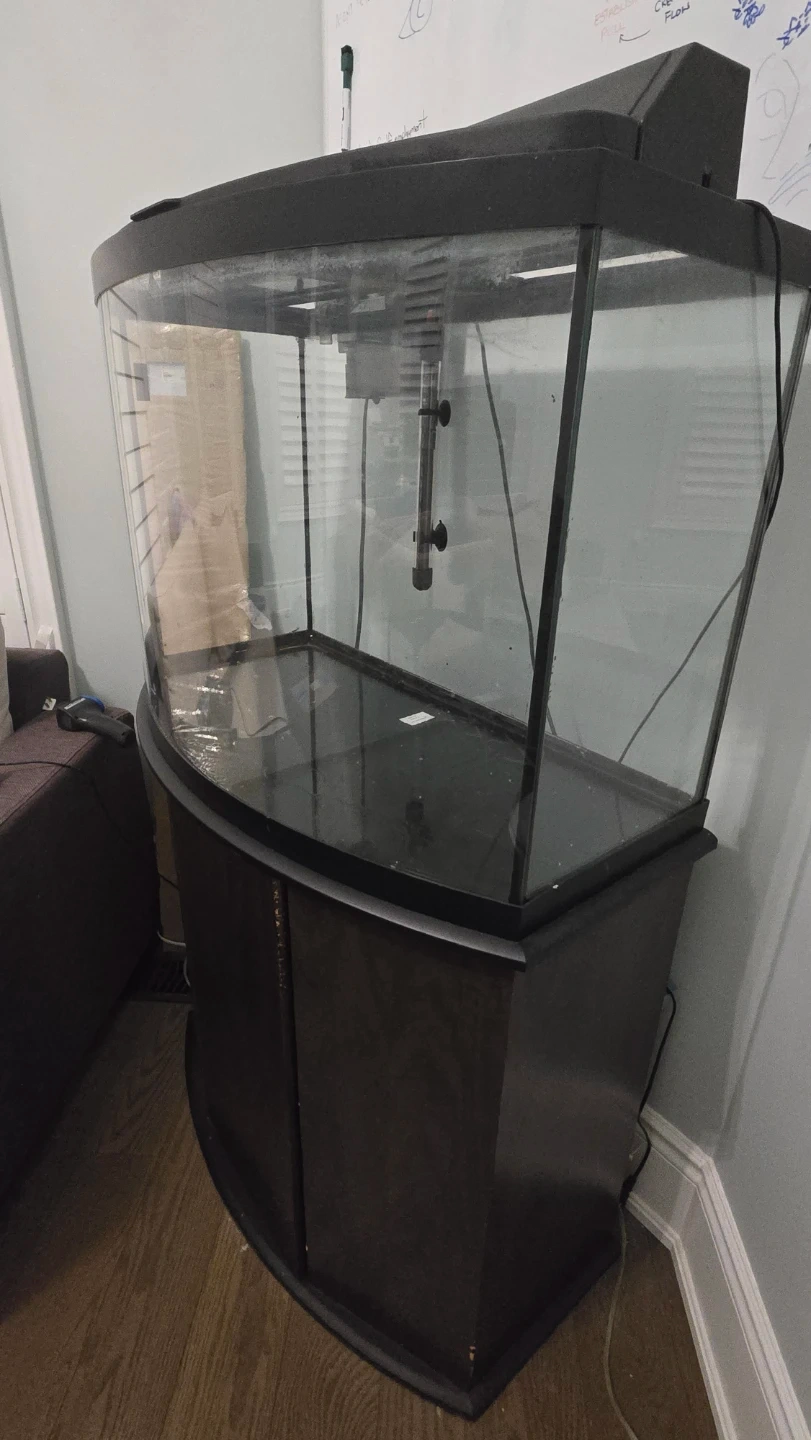 This is a curved bow style 37 gal aquarium with a dark wood stand. It comes with a heater and an AquaClear 50 filter. The tank is quite spacious, has led lights, suitable for a good variety of fish.