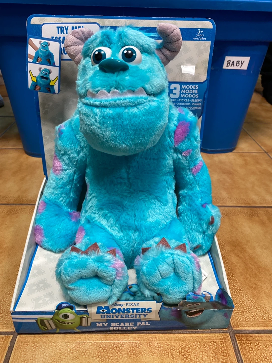 Selling Disney Pixar Monsters Inc University My Scare Pal Sulley Talking Plush. 15 different phrases & sounds! This is a 12-inch toy. Features talking, mouth & eyebrow movement when you press both sides of his belly! It has 3 Modes: Scare, Tickle and Sleepy. Just shake him to switch modes! Perfect for both children & adult collectors, this talking plush brings the beloved character to life in a fun & interactive way. Brand New in box! Box has a bend in one front corner. Look at pic.