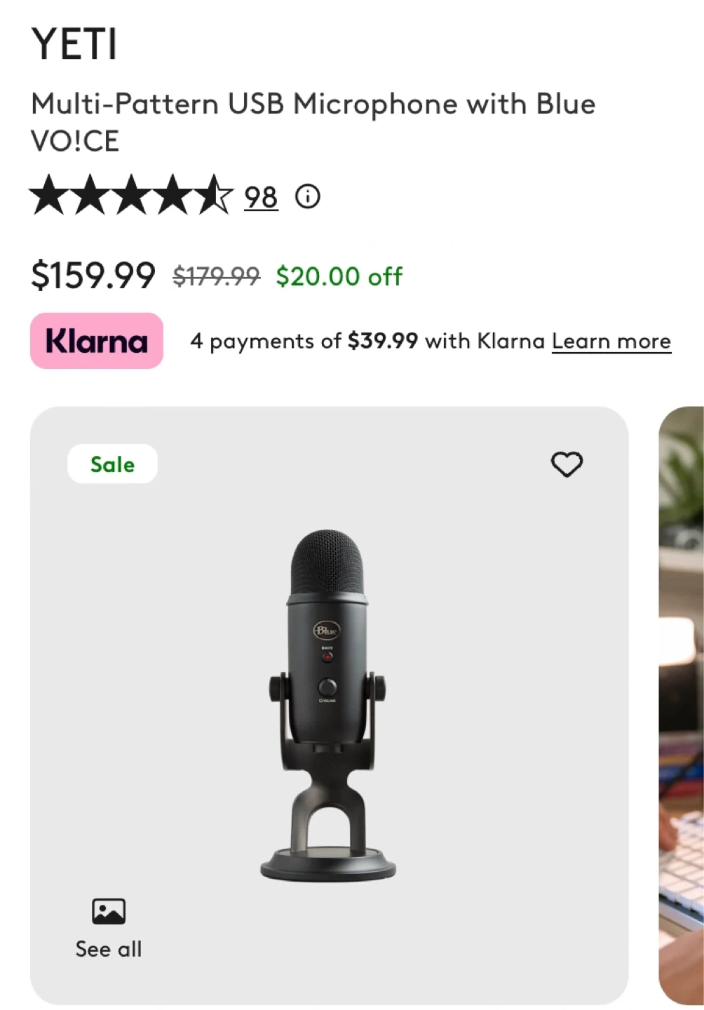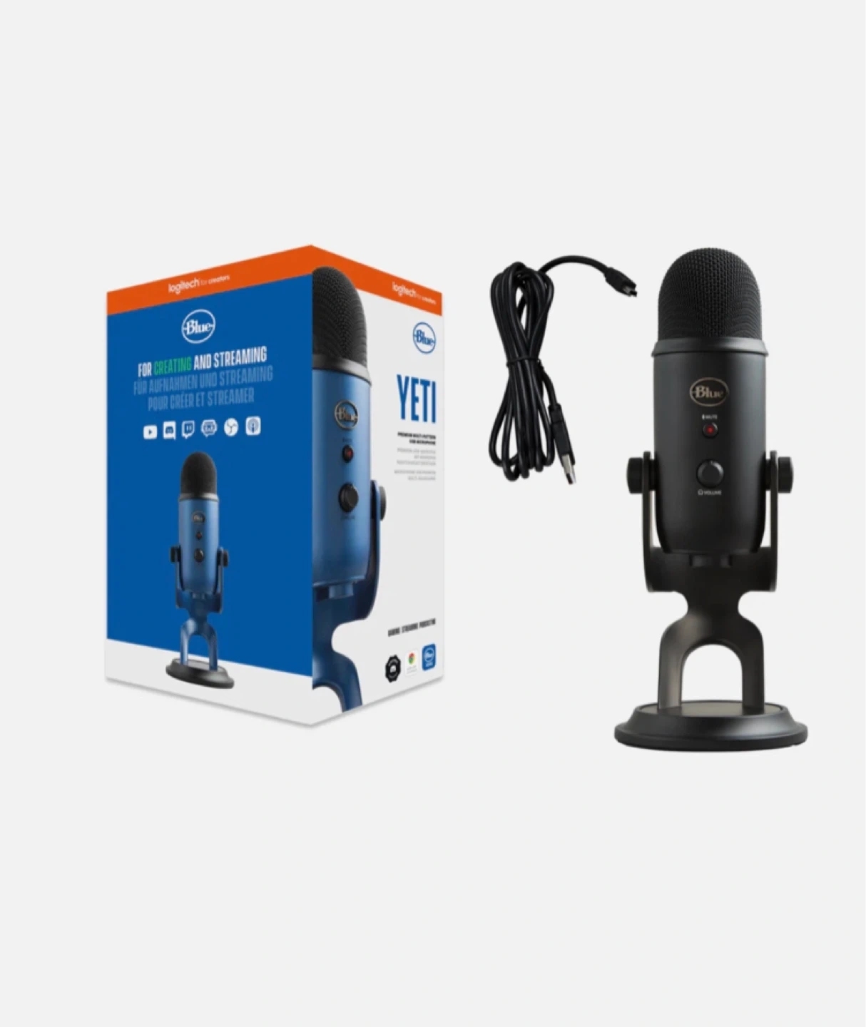 This Blue Yeti USB microphone is ideal for creators and streamers. It's a multi-pattern microphone with a volume knob and mute button. Includes the original box and USB cable.