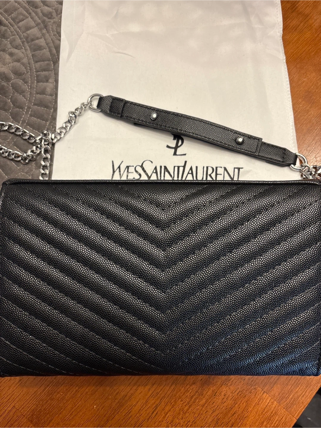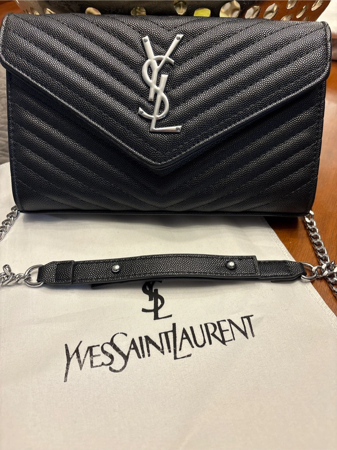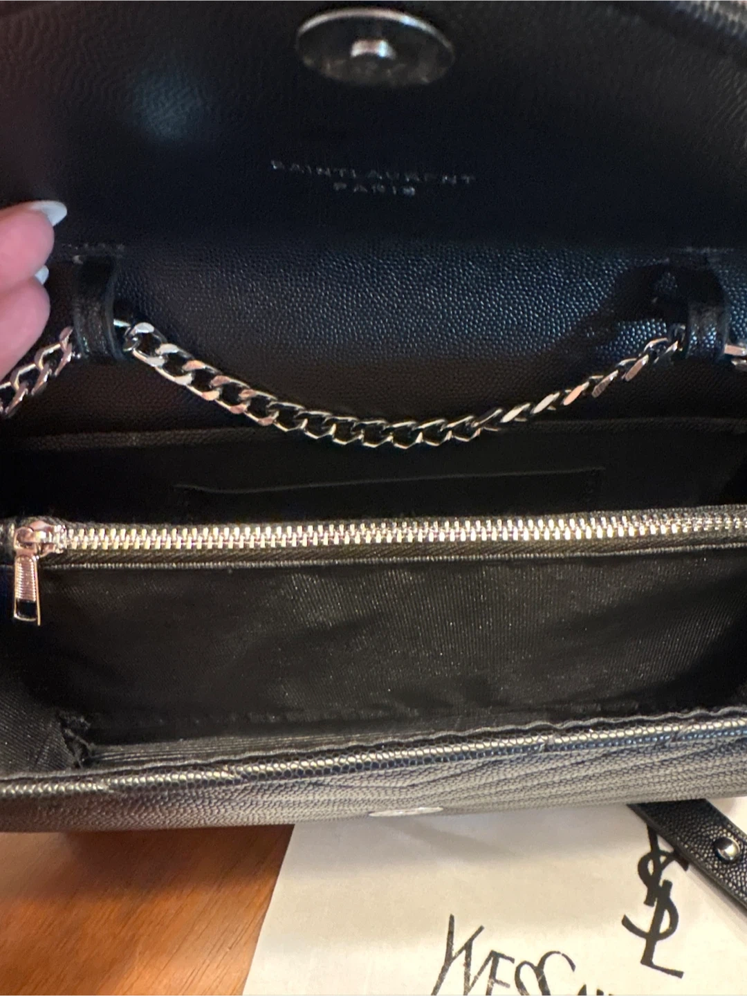 This Saint Laurent (inspired) wallet on a chain purse is crafted from black quilted leather. It features a silver-tone YSL logo and a silver chain strap. Inside, it has multiple card slots and a zippered pocket. Includes dust bag.