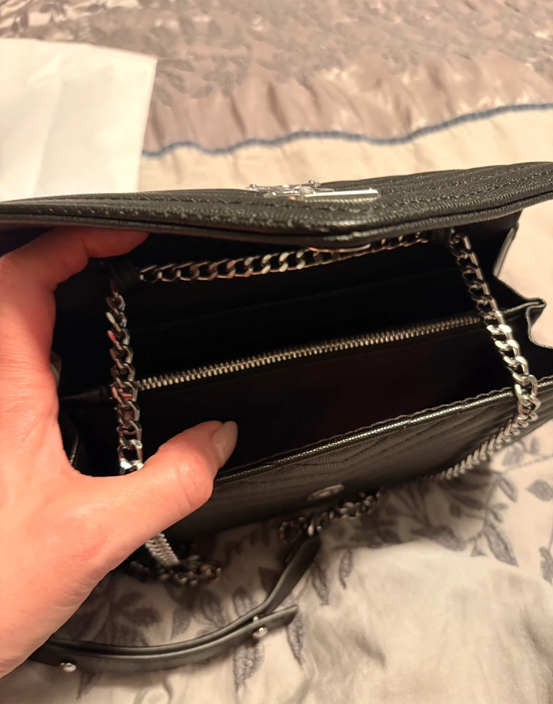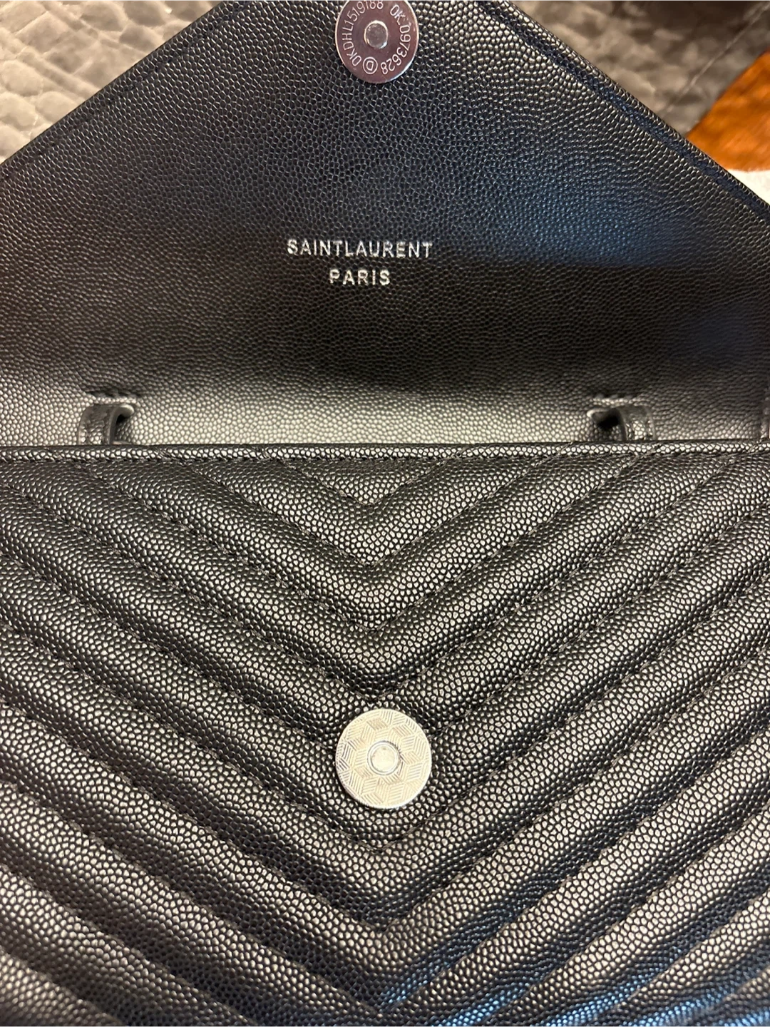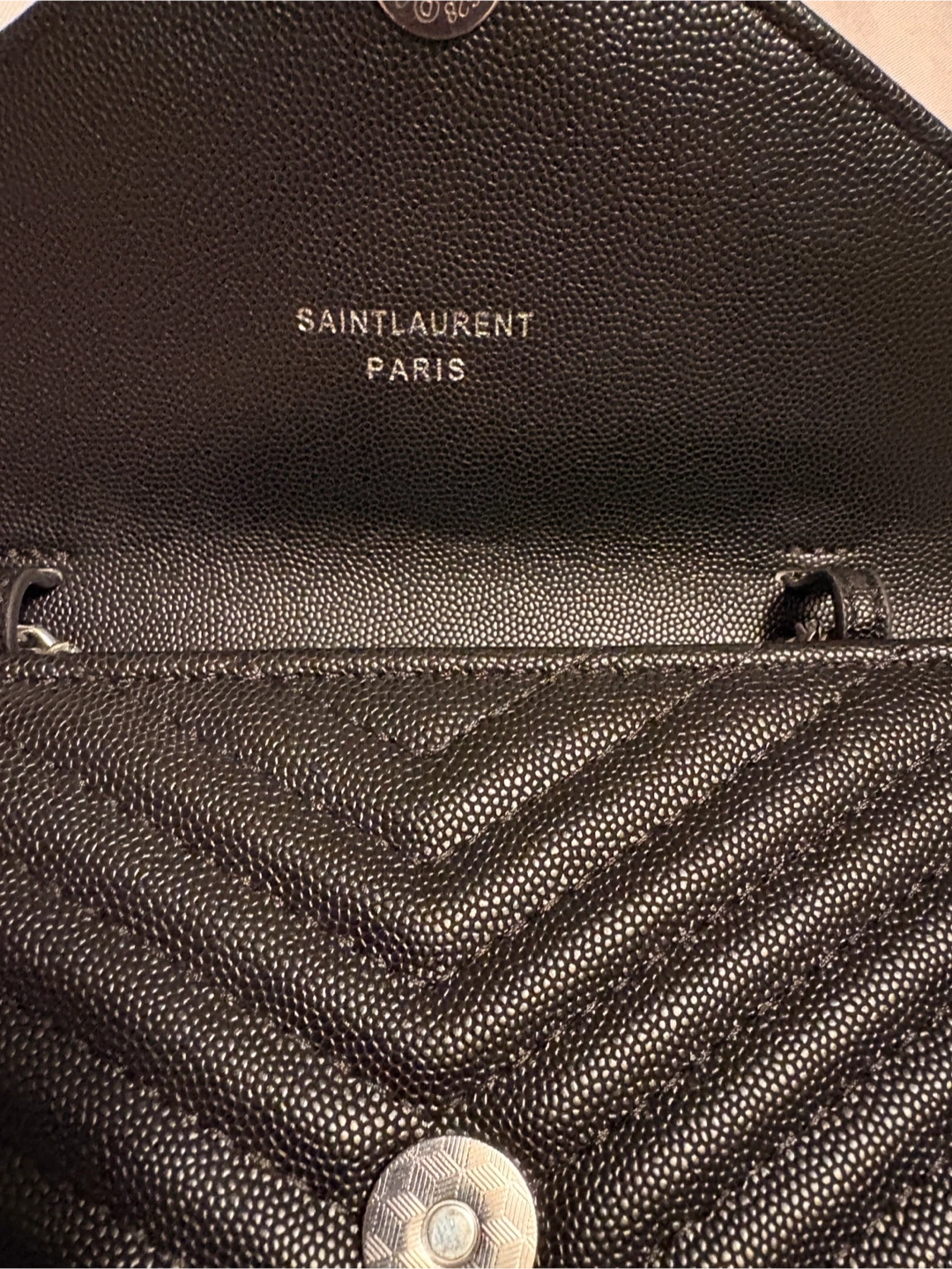 This Saint Laurent (inspired) wallet on a chain purse is crafted from black quilted leather. It features a silver-tone YSL logo and a silver chain strap. Inside, it has multiple card slots and a zippered pocket. Includes dust bag.