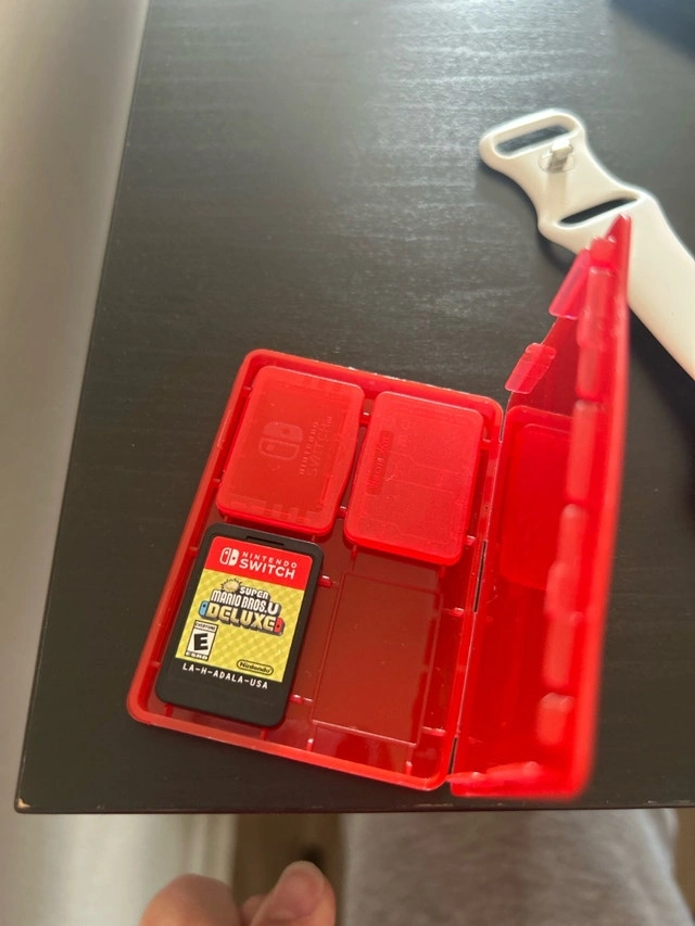 Super Mario Bros. U Deluxe game cartridge, and charging dock.