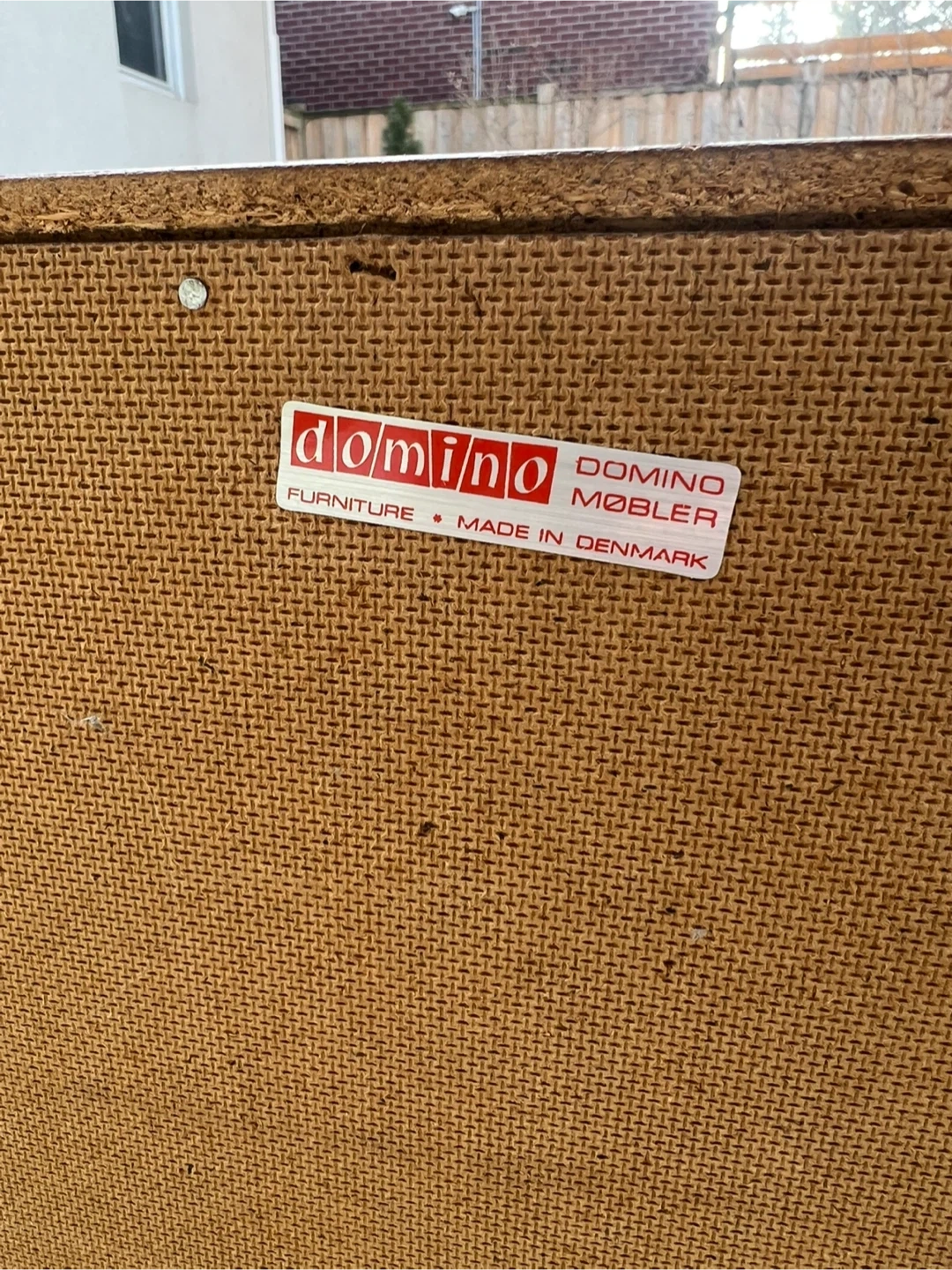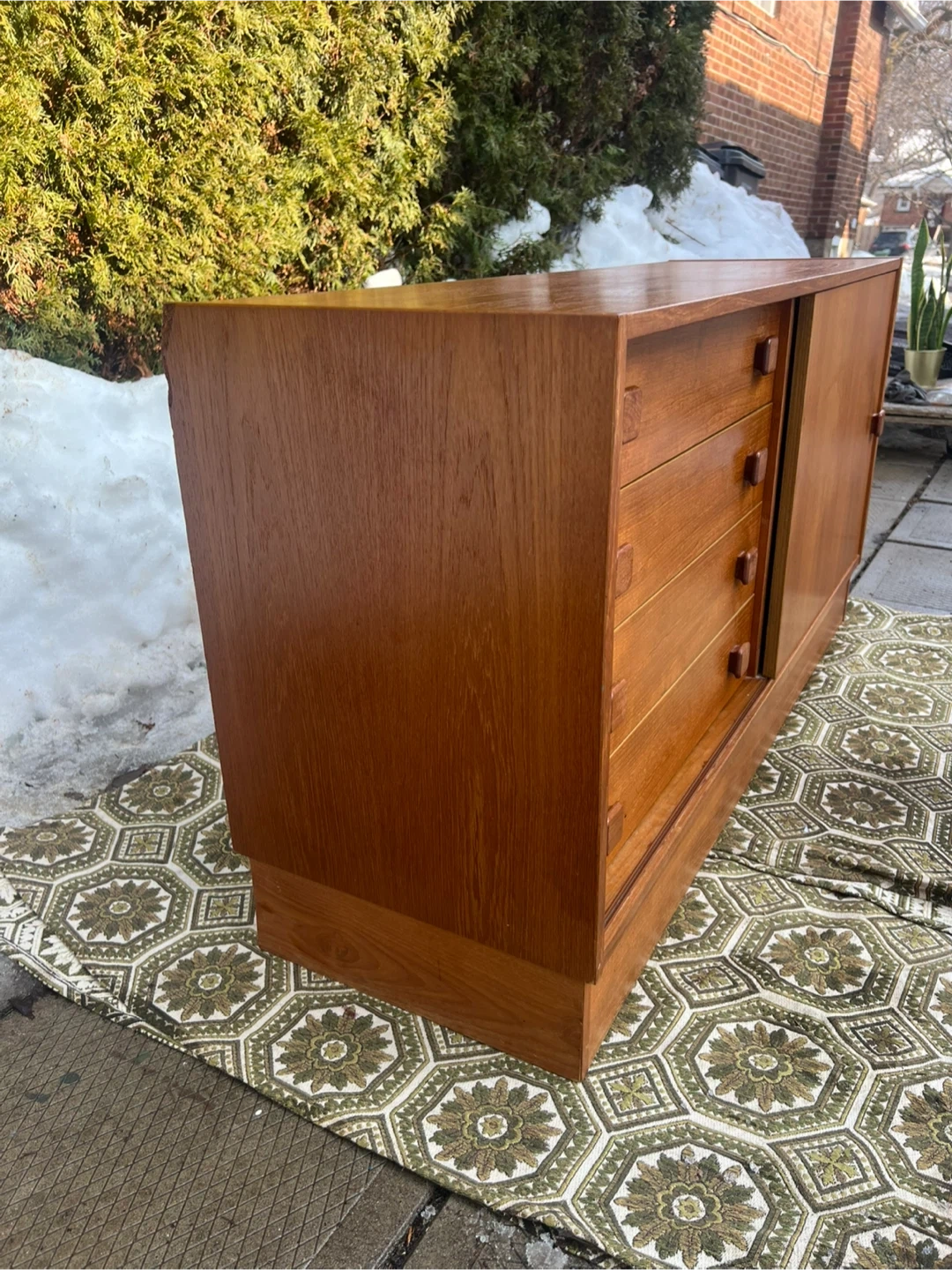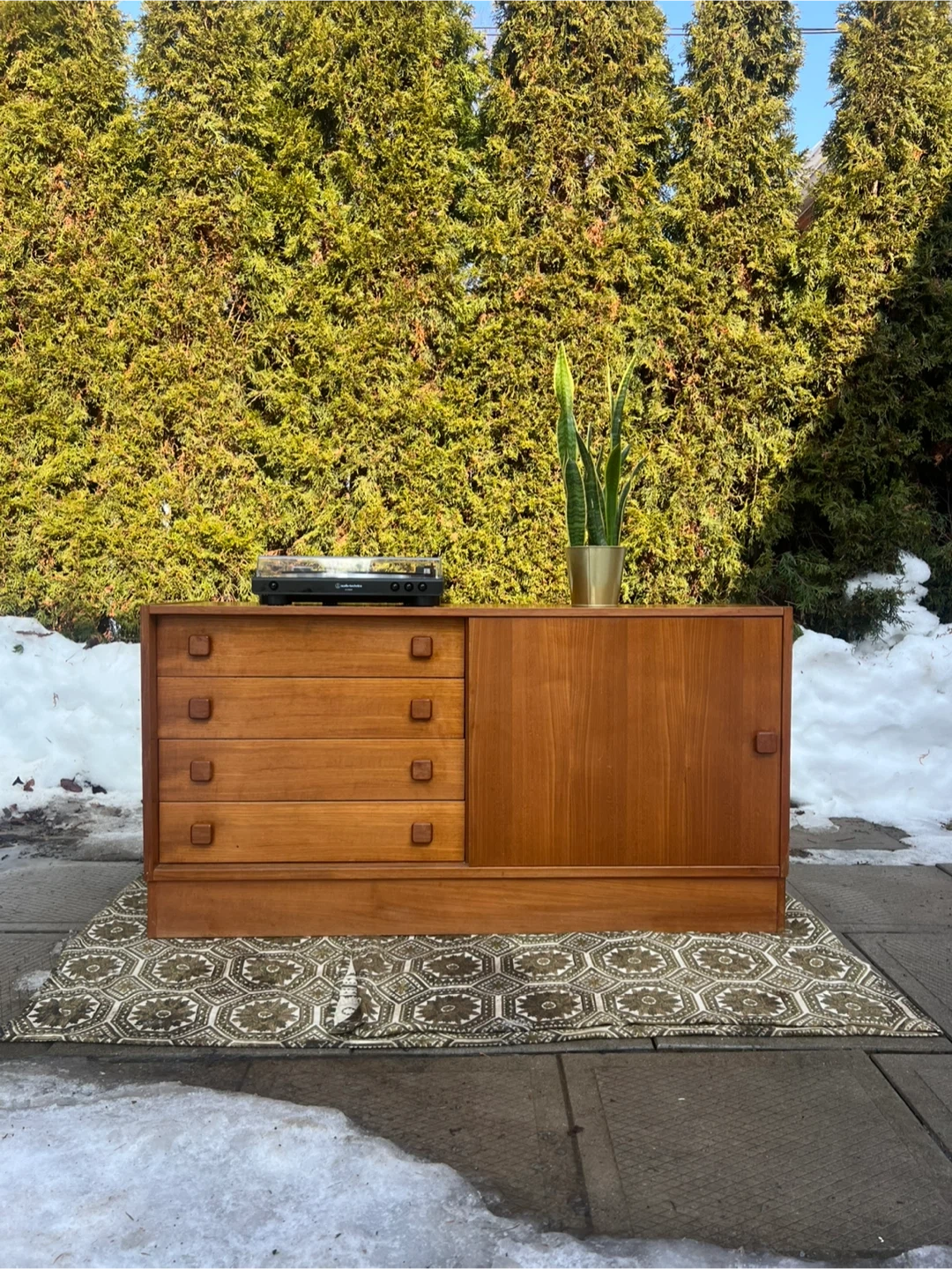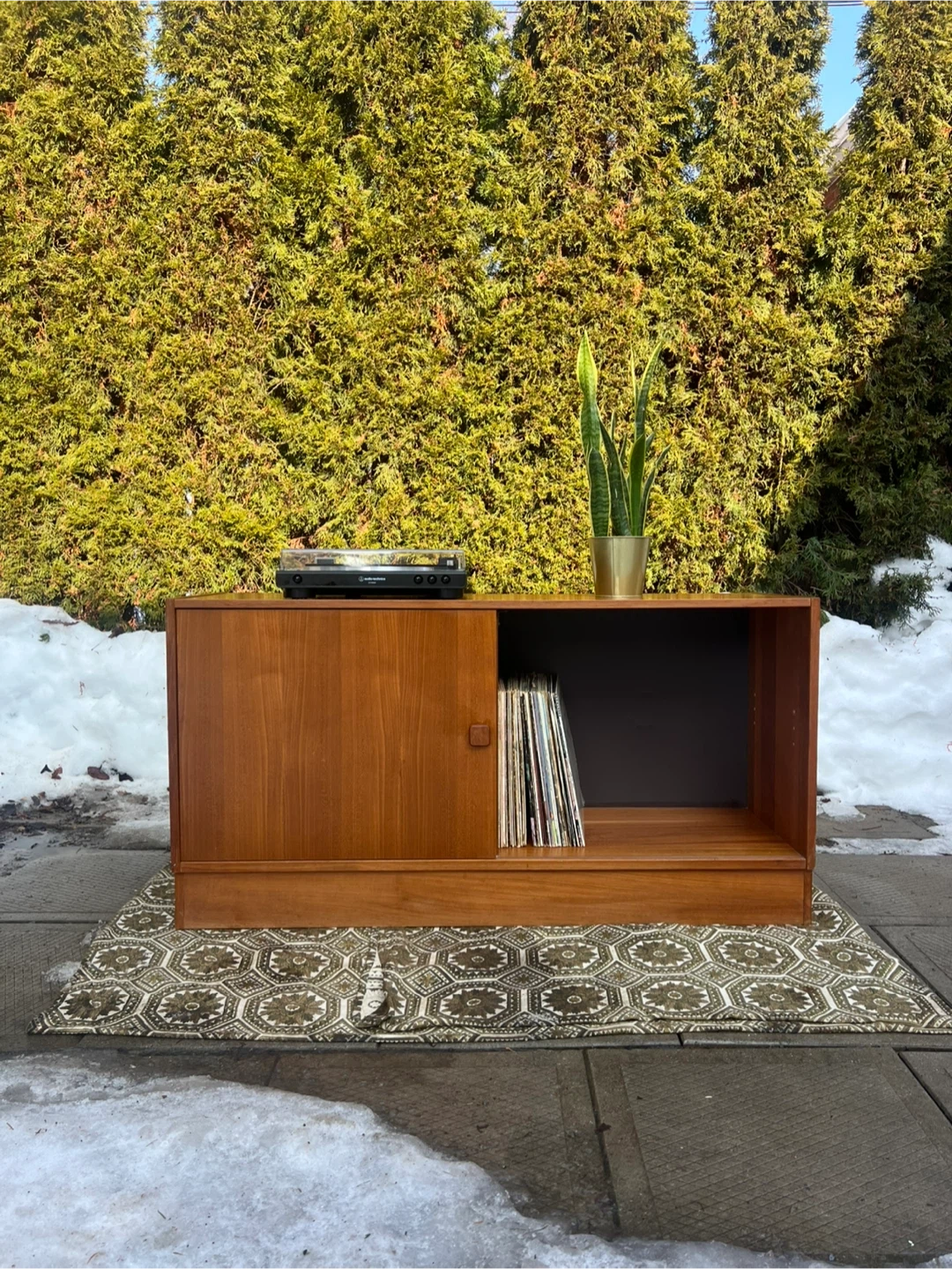 Compact Mid Century Modern teak cabinet by Domino Møbler, showcasing a warm, rich teak finish and clean Scandinavian lines. In good vintage condition, it works beautifully as a credenza, TV stand, or record cabinet. Perfectly sized for vinyl storage, with an adjustable interior shelf for flexible organization.
