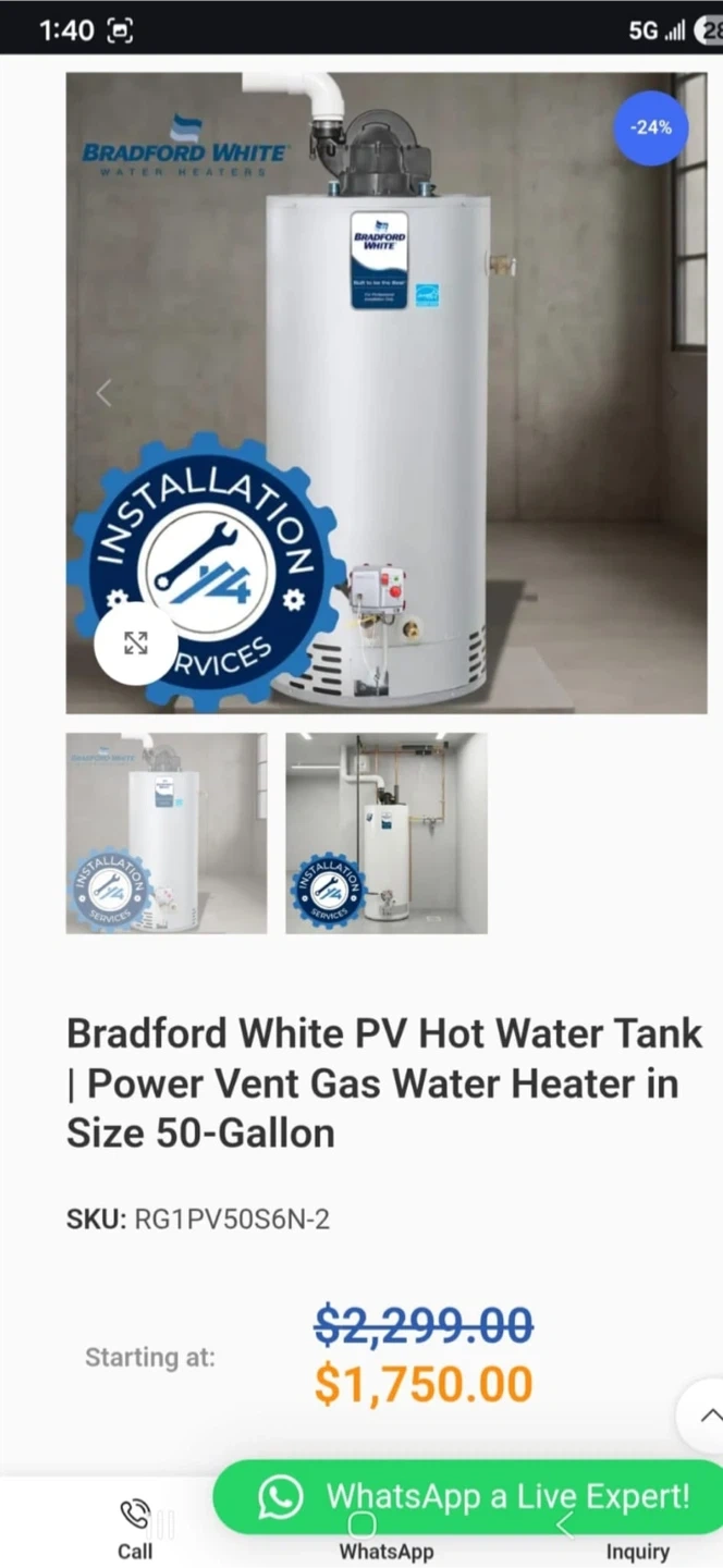 Bradford White PV Power Vent Gas Water Heater. 50-gallon capacity. It's a white gas water tank. This unit is suitable for home heating needs.
