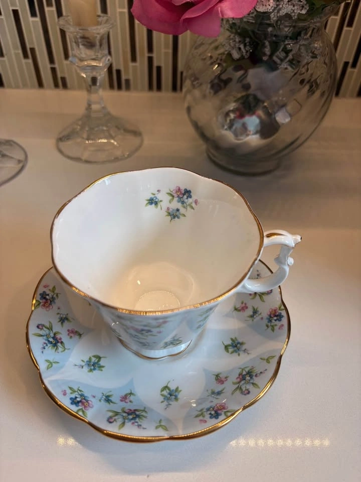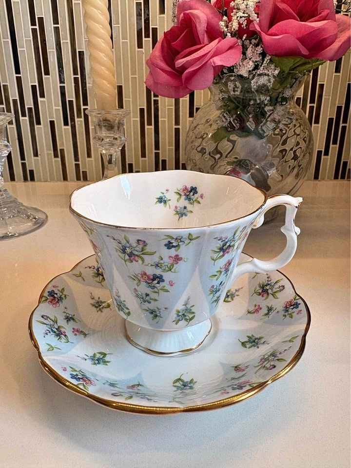Beautiful Royal Albert Bone China teacup and saucer set. This is from the Debutante Series in the Gaiety pattern. Has pretty blue and pink floral design with light blue accents. Gold trim is on the edges of both the cup and saucer.