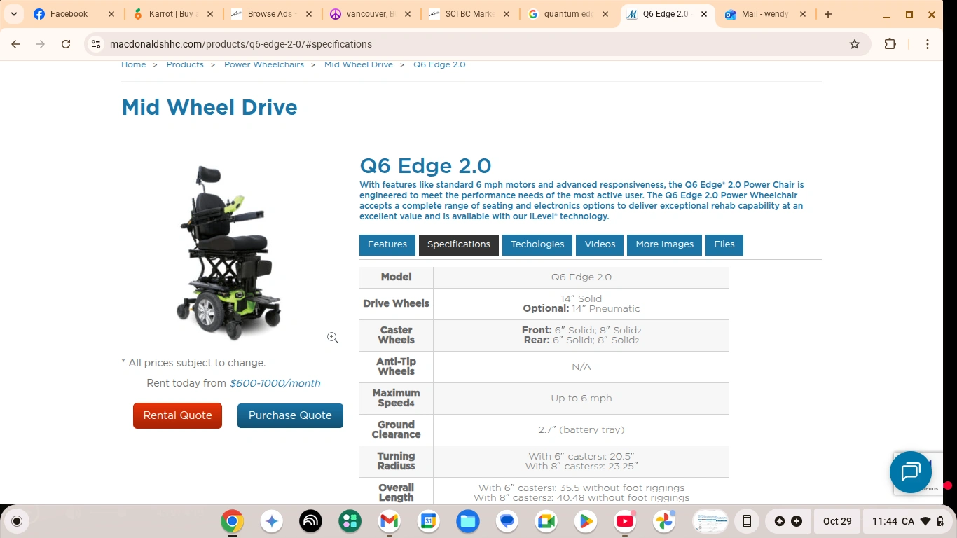 15QUANTUM Q6 EDGE 2 With features like standard 6 mph motors and advanced responsiveness, the Q6 Edge® 2.0 Power Chair is engineered to meet the performance needs of the most active user. The Q6 Edge 2.0 Power Wheelchair accepts a complete range of seating and electronics options to deliver exceptional rehab capability at an excellent value and is available with our iLevel® technology. Purchased in 2020 for over $10,000. Comes with brand new batteries and arm rests worth $1000 Can withstand rough terrain and can spin on a dime: https://www.youtube.com/watch?v=W6SsUQFWs4w https://macdonaldshhc.com/wp-content/uploads/2017/07/ca_q6_edge_2.0_ss_e.pdf https://macdonaldshhc.com/wp-content/uploads/2017/07/ca_q6_edge_2.0_ss_e-1.pdf