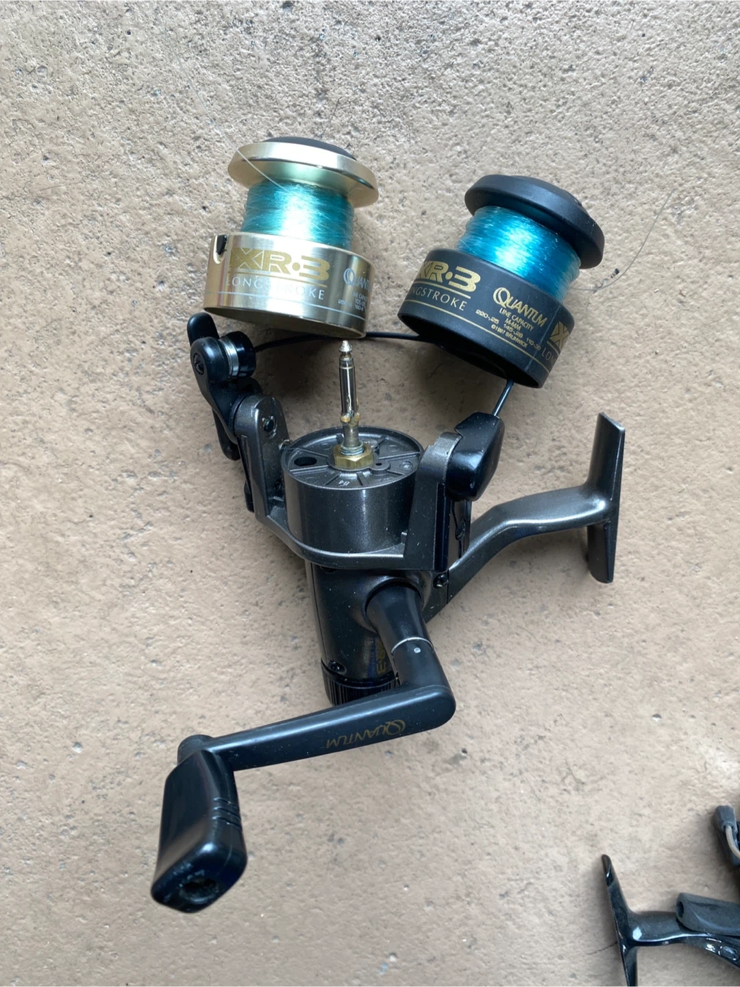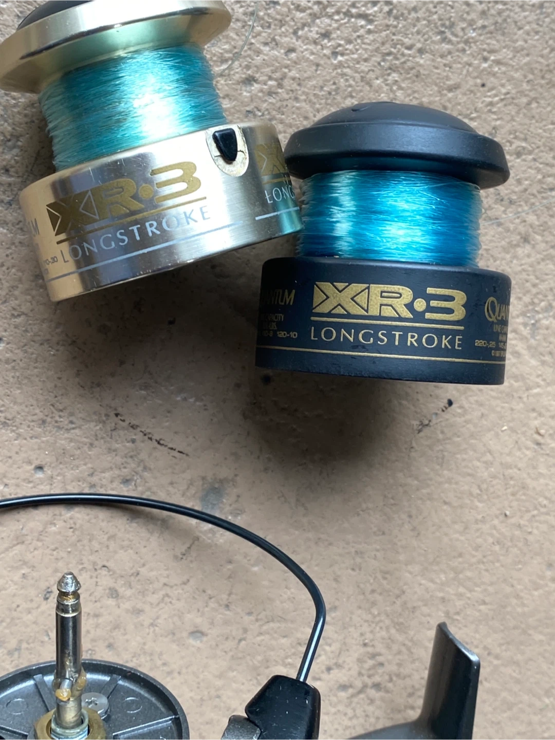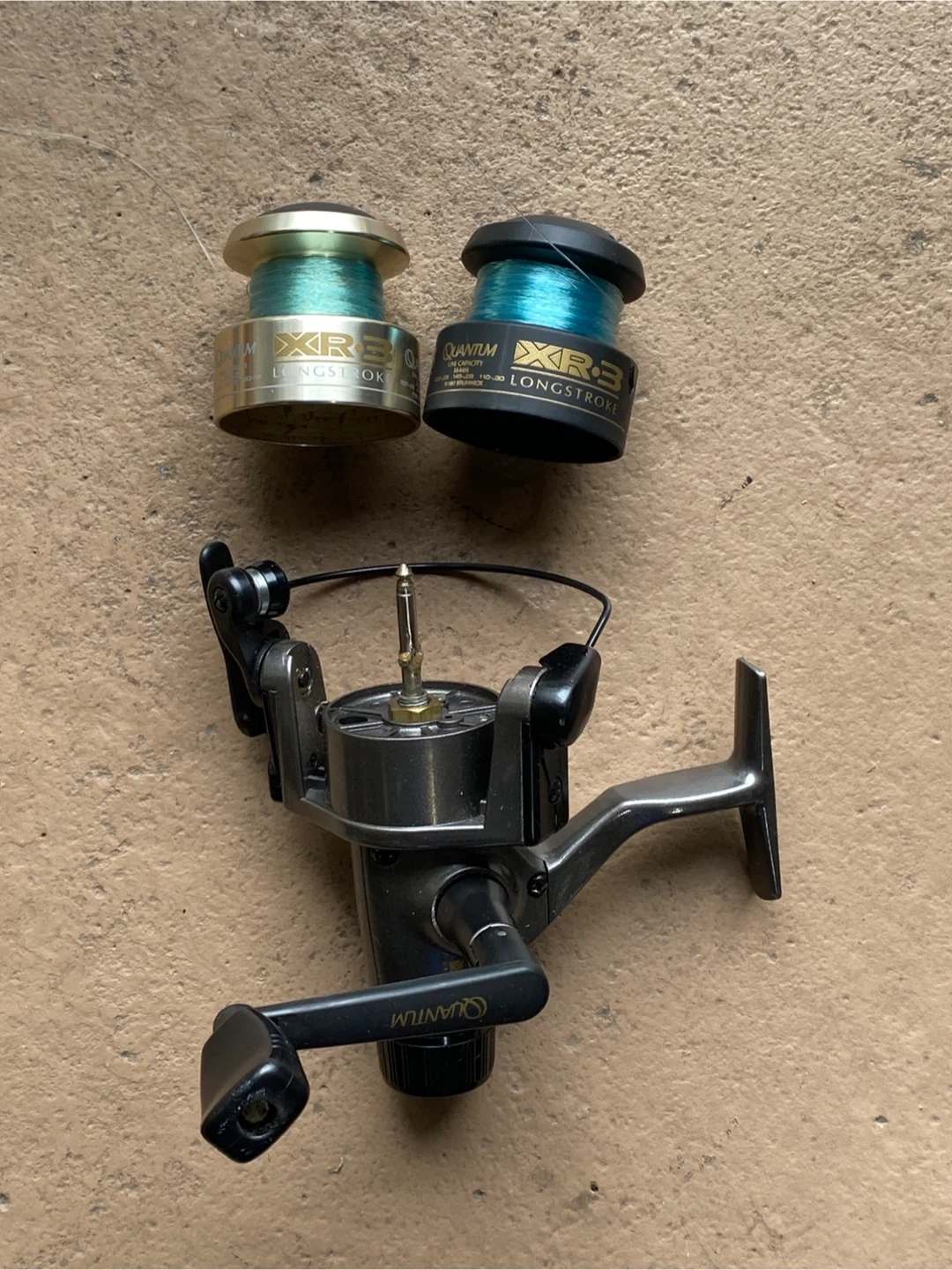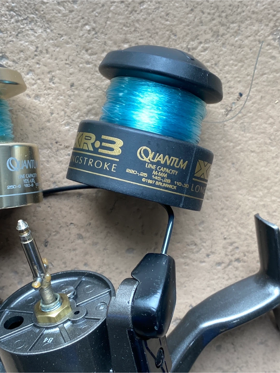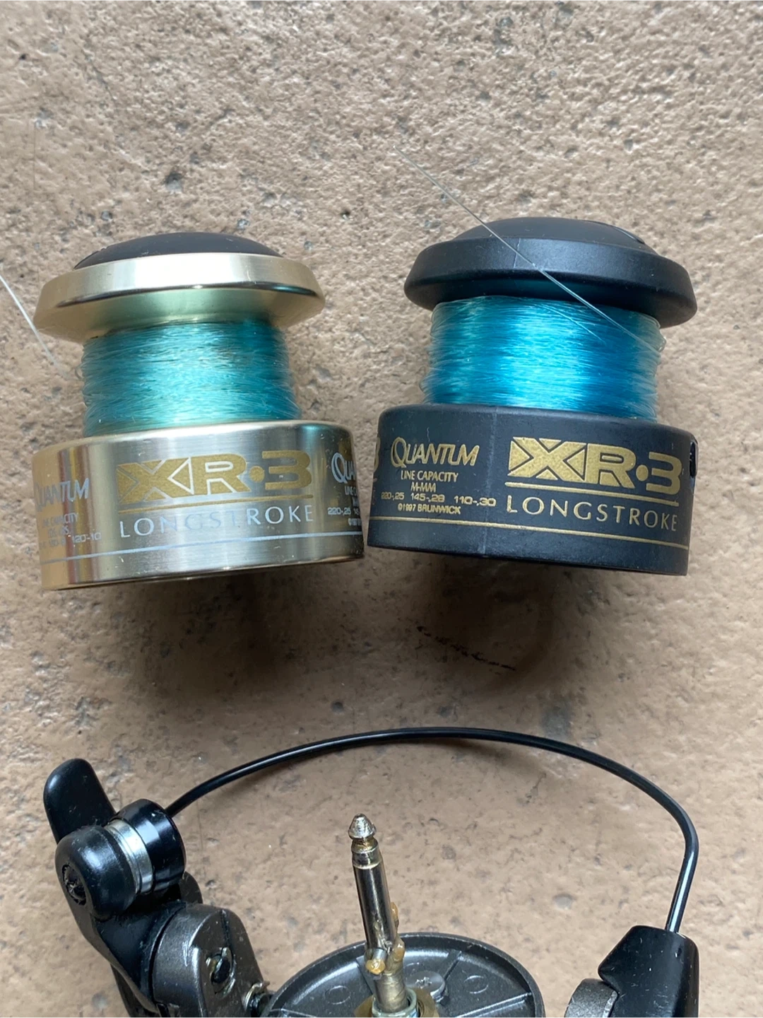Selling a Quantum XR-3 Longstroke fishing reel. It appears to be in good condition and ready for your next fishing adventure! One spool is gold and the other is black. Line capacity is visible on the spools. OBO