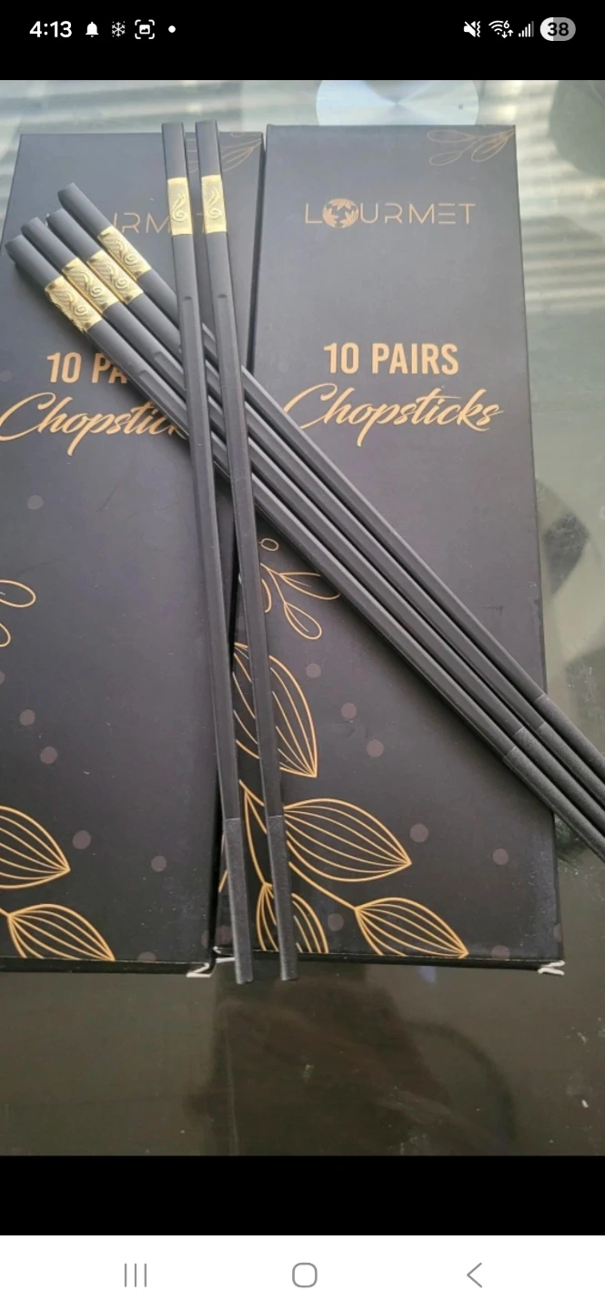 black chopsticks from Gourmet. They have a stylish gold accent near the top. The chopsticks come in their original packaging.
