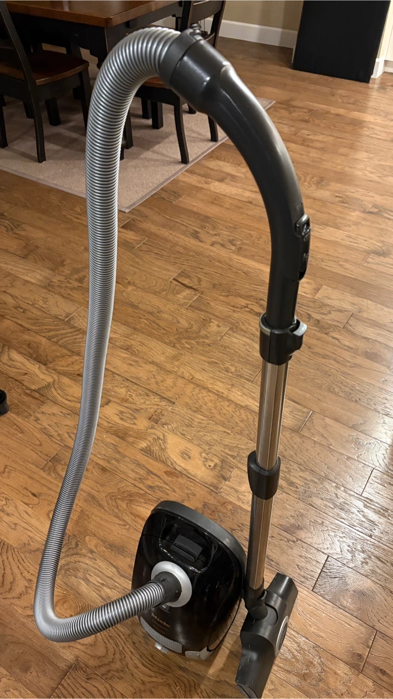 This is a Miele Compact C1 PowerLine vacuum cleaner. It includes the main unit, hose, and various attachments. Excellent for keeping your floors spotless! Great for hard wood floors and low-pile rugs. Excellent condition. Powerful suction and lightweight, this vacuum is perfect for efficient, everyday cleaning in homes, apartments, and offices. Ideal for hard floors and low-pile area rugs. Comes with extra Turboteq powerhead for more efficient vacuuming of rugs. Perfect for those seeking a compact, lightweight, and easy-to-use bagged vacuum.
