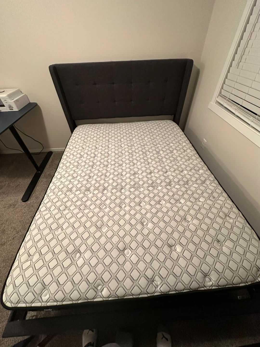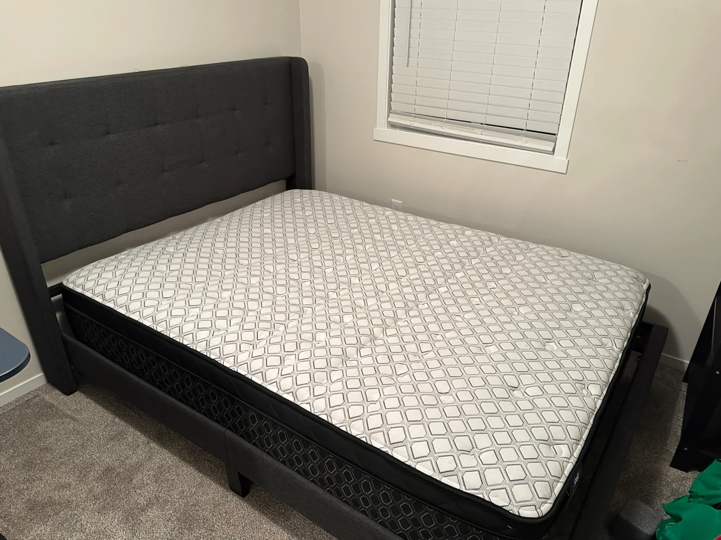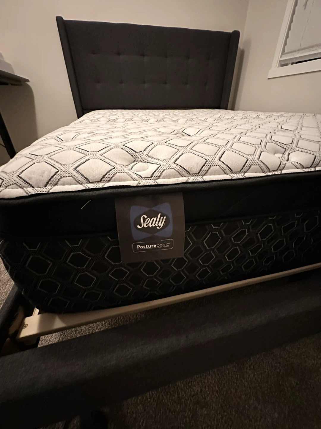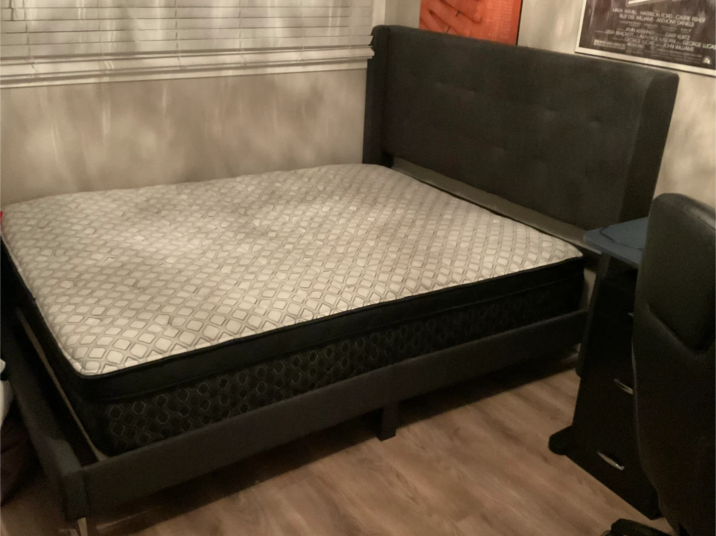 10Gorgeous upholstered blue/grey Queen headboard and rails. With the slats, there’s no need for a box spring. Less than two years old. In near perfect condition. Dimensions are W: 66” L: 88” and is 21” high to the top of the mattress. Comes with a luxurious Sealy Posturepedic mattress, also less than two years old. Pristine condition. Vacuumed every two weeks. No stains, burns or tears. Smoke and pet free home. $275 o.b.o