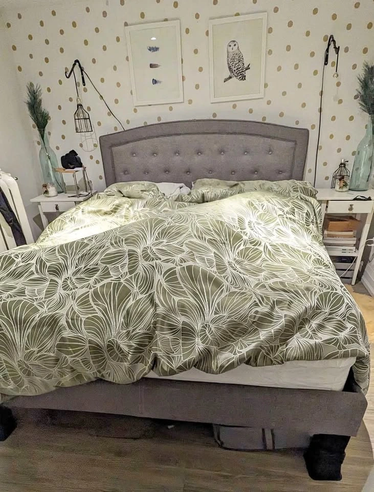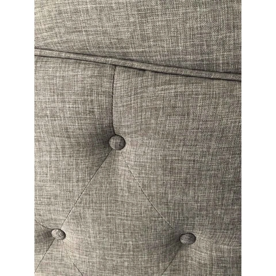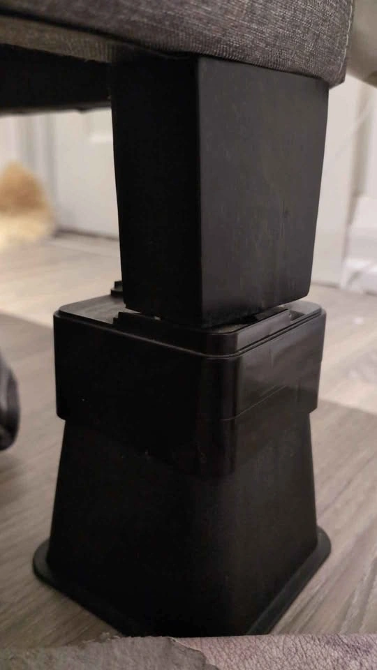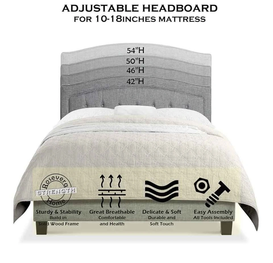 83Grey upholstered tufted platform queen bed frame with adjustable headboard. -62" wide -85.5"L -42"-54" tall (adjustable headboard) -4" feet Comes with bed elevators as shown that double the bed's height if desired. Mattress not included. Purchased for $375. Pick up only.