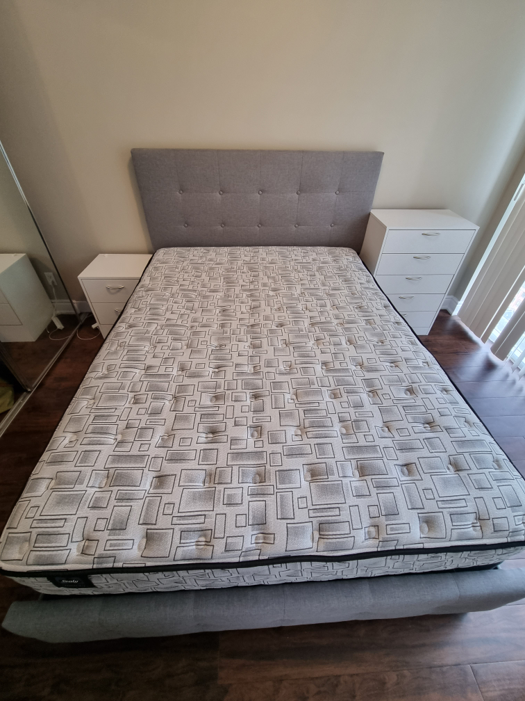 87Used Queen sized bed in good condition. The set includes a Seely mattress, a bedframe and a bed box. The price listed is for the entire set. However, I am willing to sell the individual pieces separately if needed. Please discuss with me about the price if you wish to buy an individual piece from the set. Price is negotiable. Pickup only; please arrange your own delivery/shipping if needed. Please also arrange collection date to be on 23 August (latest 3pm) as I will still be using the furniture before moving out. Only cashless payment is accepted for this furniture.