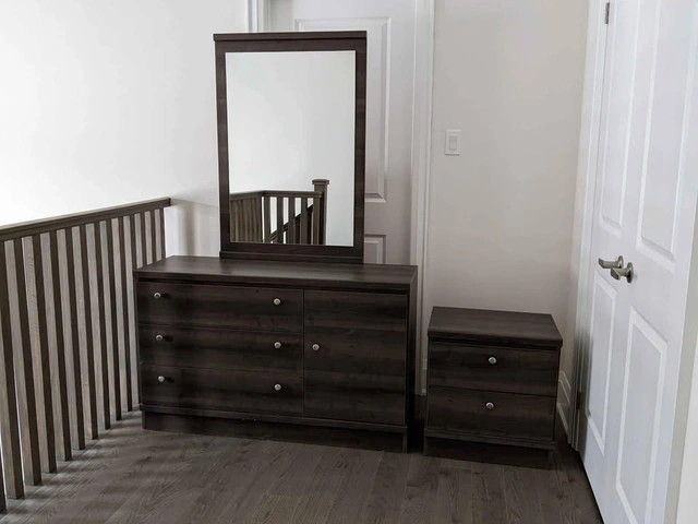10Queen bedroom set Includes dresser with mirror, night table, headboard, and metal frame. Will include unused queen box spring. Metal frame and headboard can also be used as double or full. Feel free to message if you have any questions!