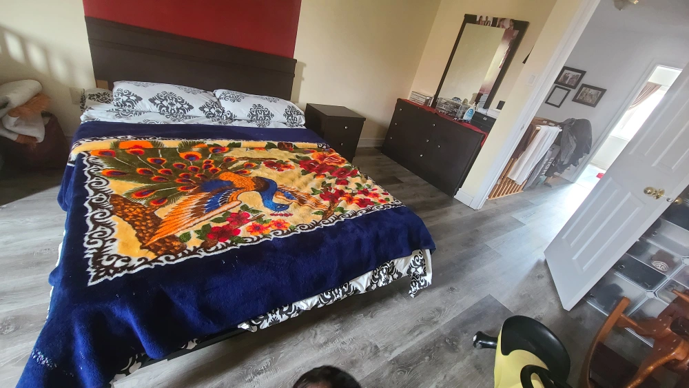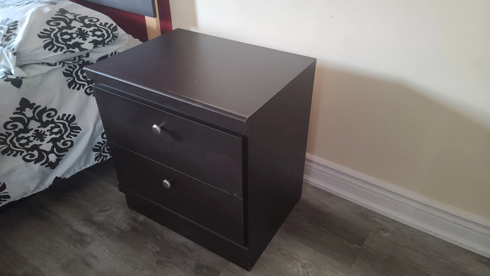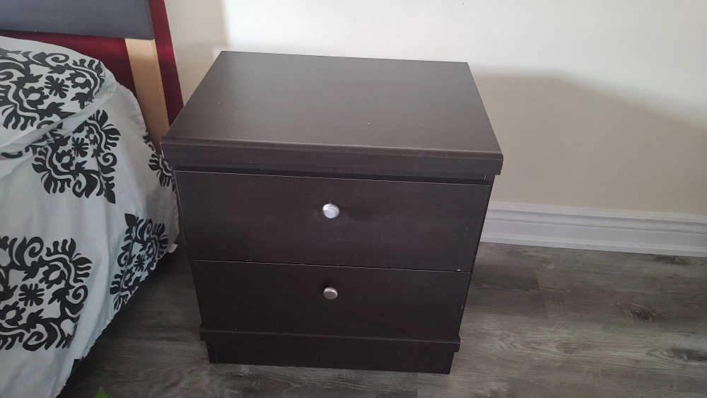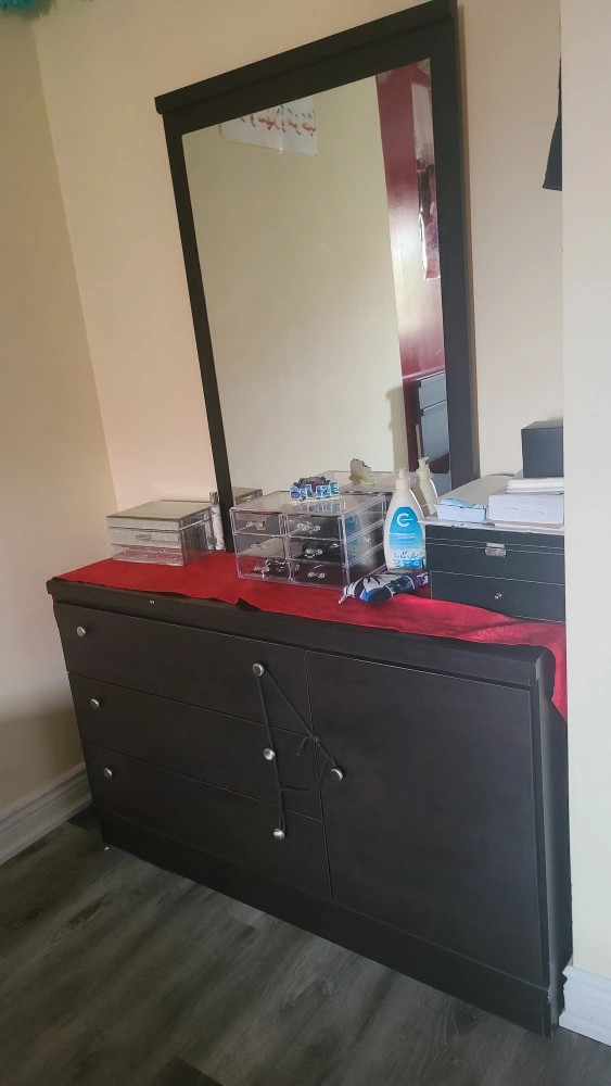 bed set comes with a queen size bed frame+ a mattress side table, which has two drawers Chester with 3 drawers and one side panel which has a shelf installed + mirror everything $500 bed and night table $240 pick up only please