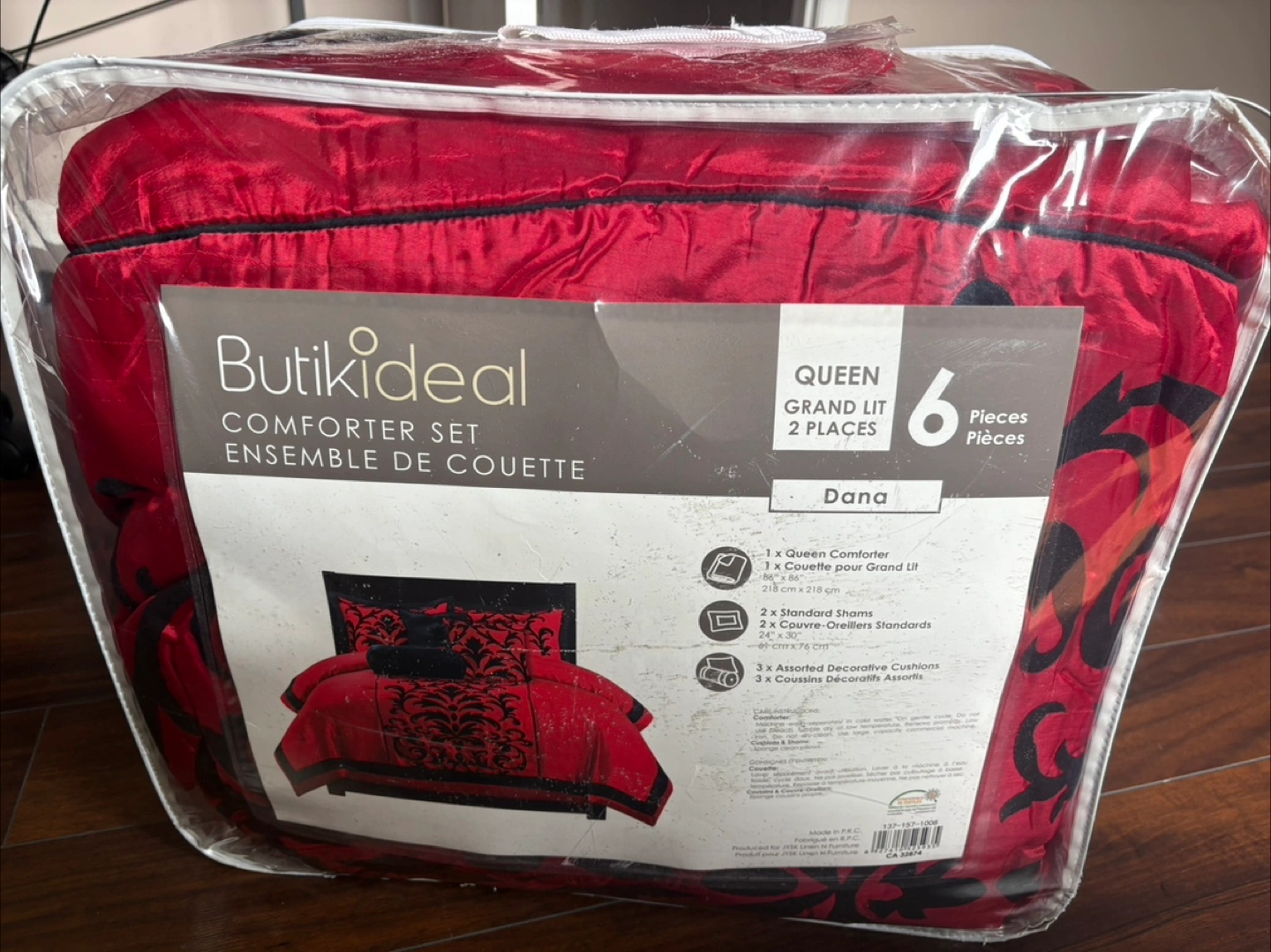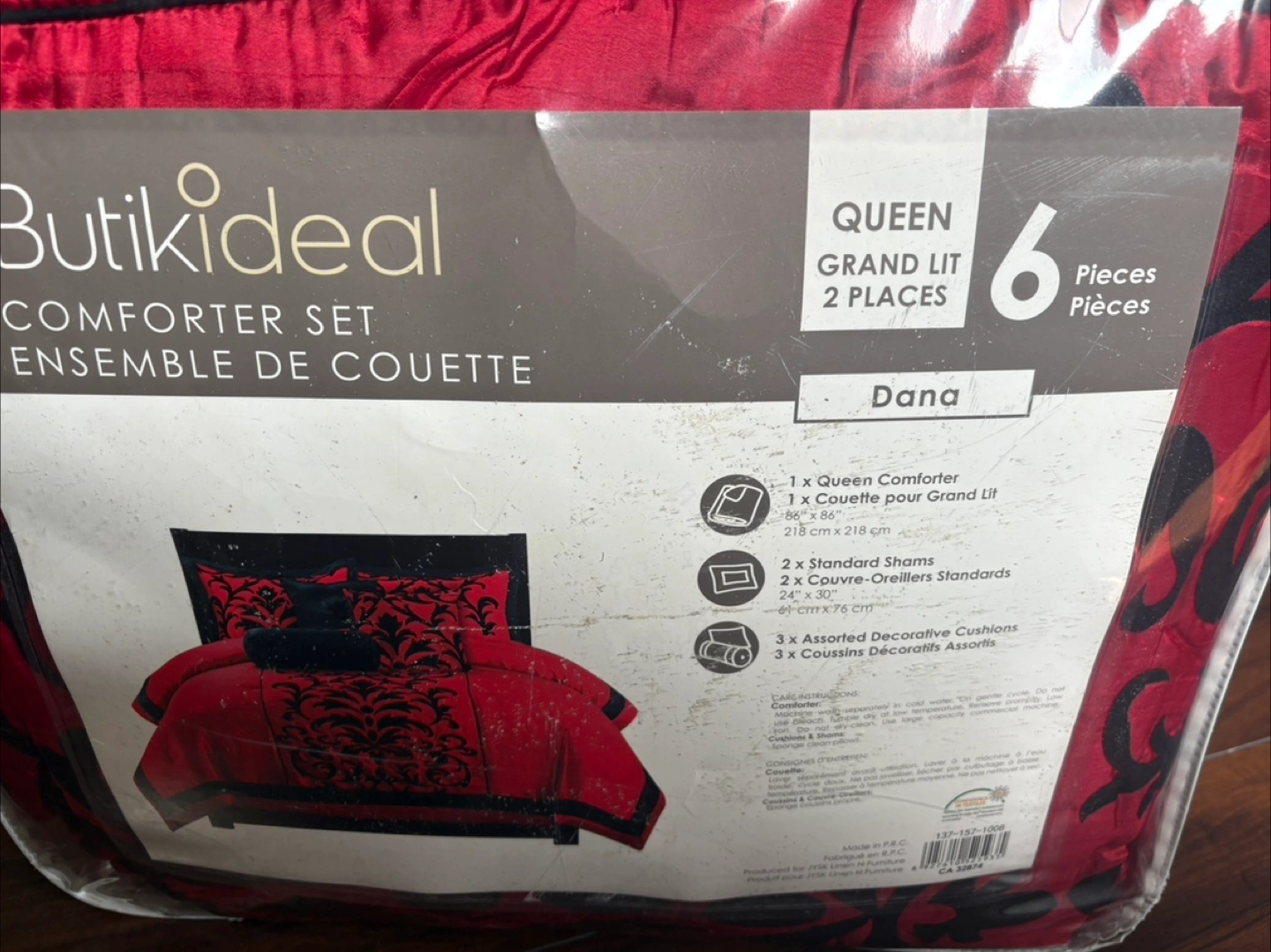 70Selling a Butikideal Queen size comforter set, still in its original packaging! This is a 6-piece set that includes: - 1 Queen Comforter (86" x 86" / 218 cm x 218 cm) - 2 Standard Shams (20" x 26" / 51 cm x 66 cm) - 3 Assorted Decorative Cushions (10" x 10" / 25 cm x 25 cm & 12" x 16" / 30 cm x 41 cm & 14" x 14" / 36 cm x 36 cm) Pick up -Kennedy/ Williams