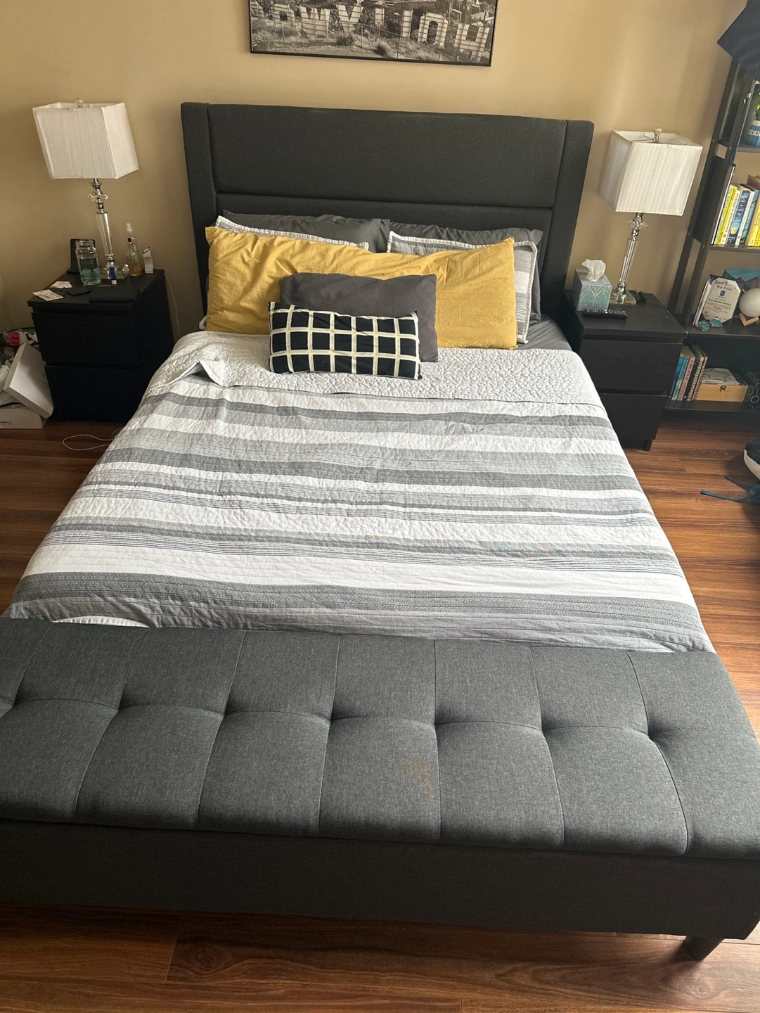 Queen-size upholstered bed frame, dark grey fabric. Includes matching storage bench attached to bed. Bought new last year, need to sell due to move. Includes mattress but no box spring.