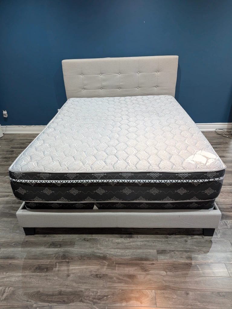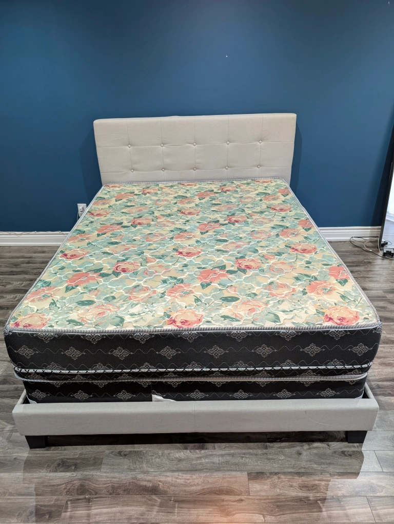 Open to offers! Selling a queen size mattress in a great condition. It's two sided (firm and extra firm). Firm side has been gently used. Extra firm side has never been used. Never been used without a mattress cover. No stains. No bumps. Very clean, pet-free and smoke-free household. The white spot in one of the corner is a sticker residue. Pickup only (I don't have a vehicle for delivery) Also have a box spring for $50.