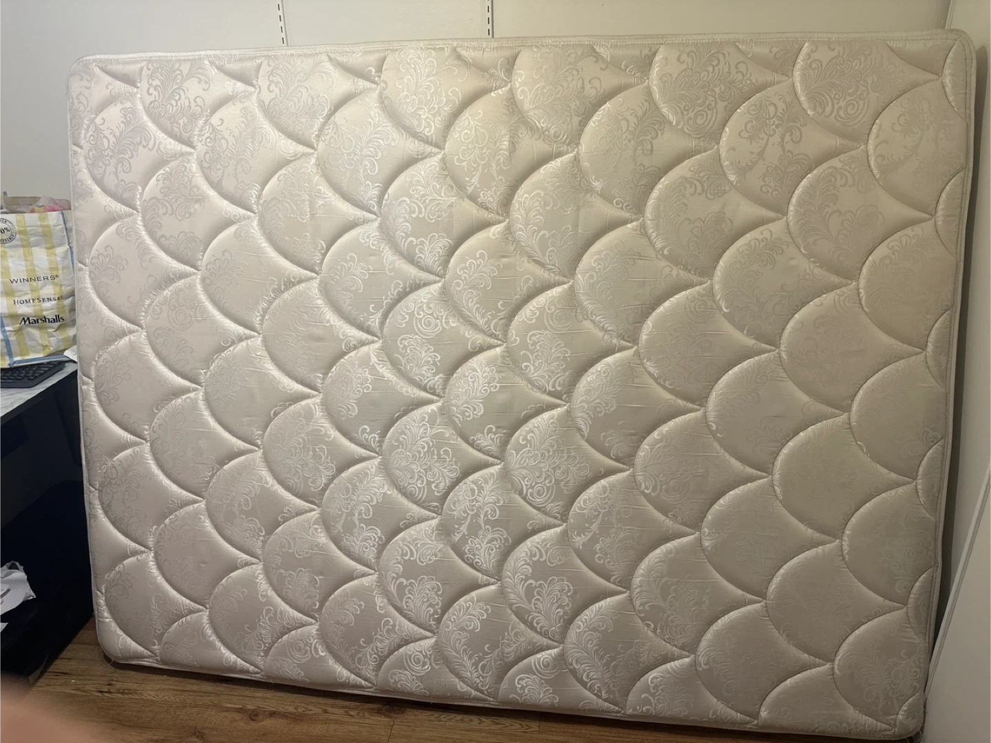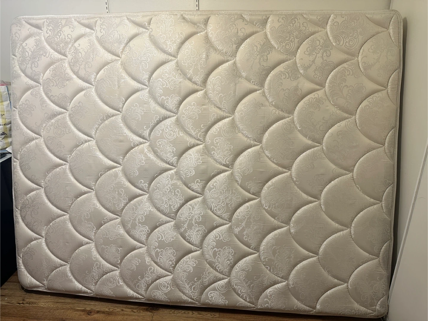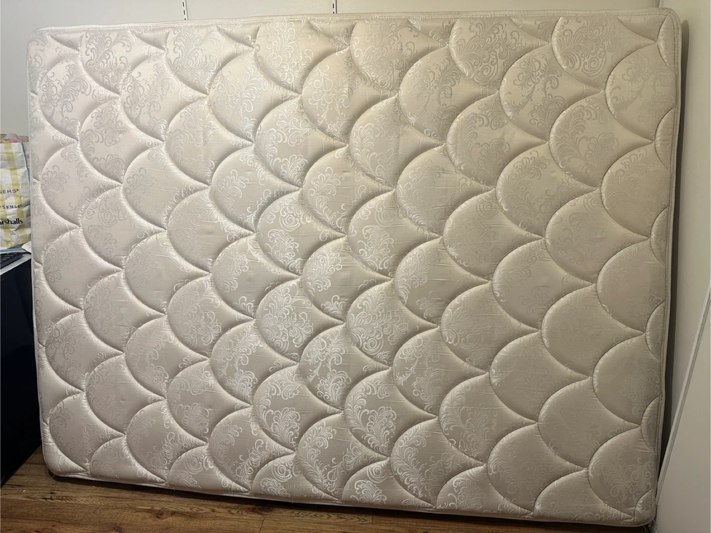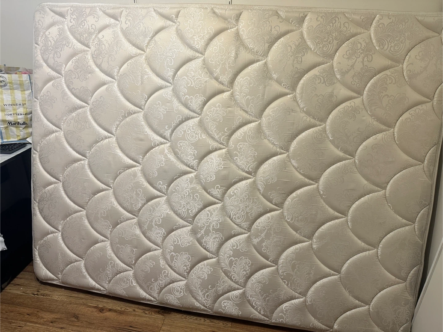 Selling a mattress in good condition. It has a patterned top and is ready for a new home!