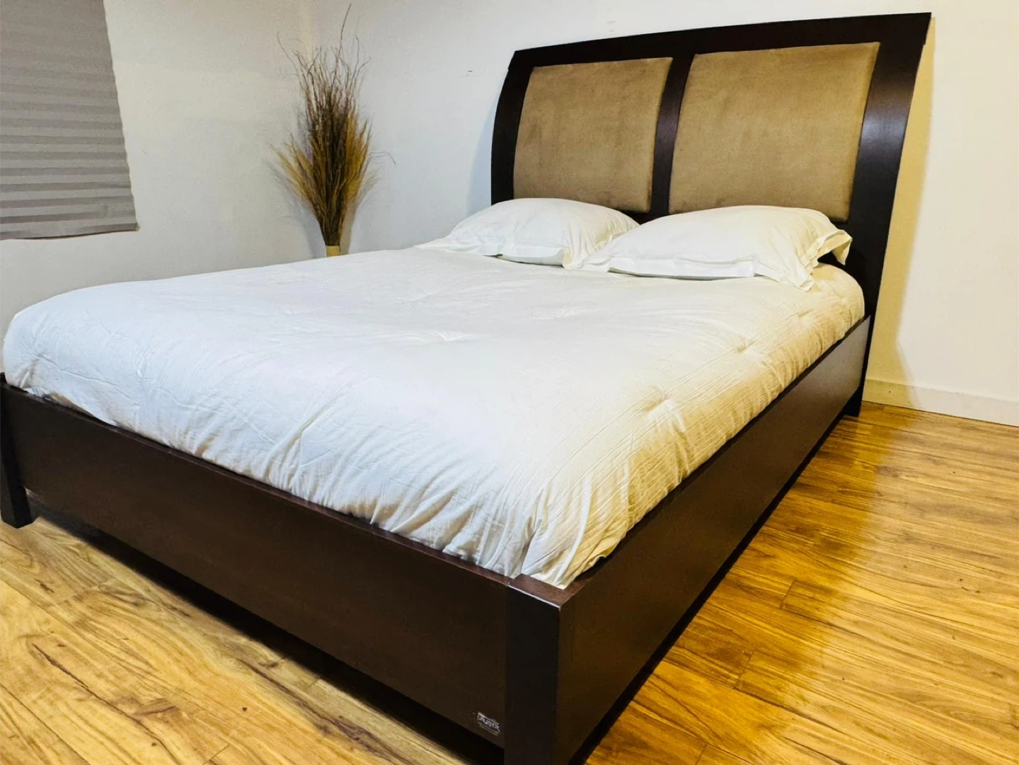 Selling a queen size bed frame in good condition. The frame is a dark wood colour with a beige upholstered headboard. It's a sturdy and stylish piece that would look great in any bedroom. Pillows and bedding not included. No include mattress