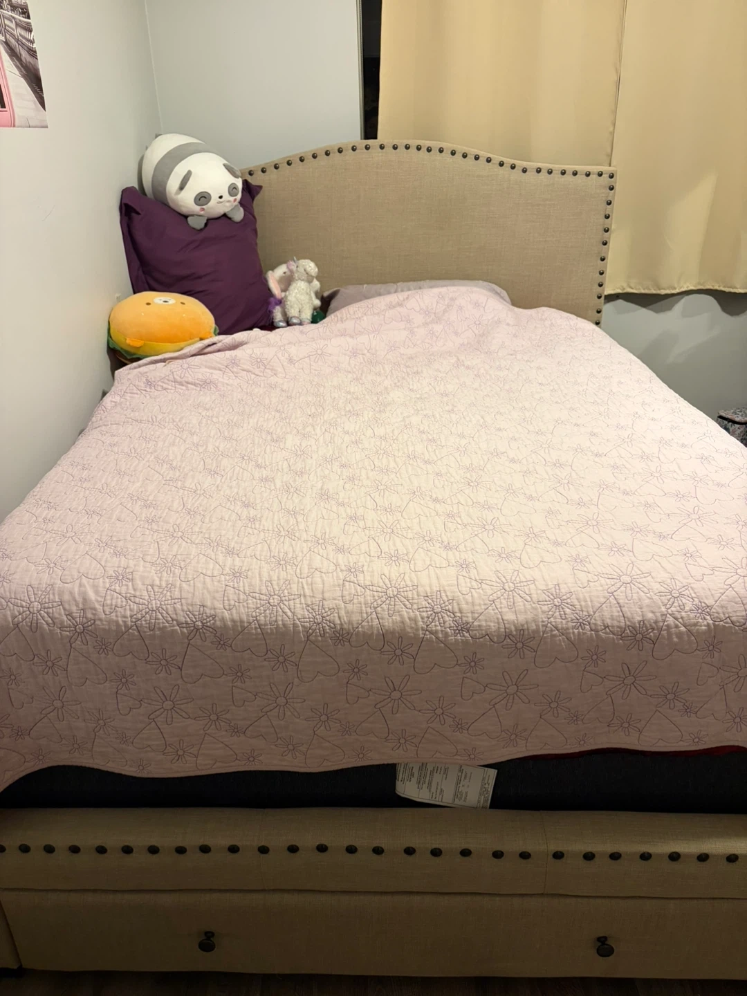 10Selling a lovely upholstered bed frame with a headboard. It's in great condition and would look fantastic in any bedroom! The neutral colour makes it easy to match with any decor. It has a headboard with nailhead trim. It also has a built in drawer.