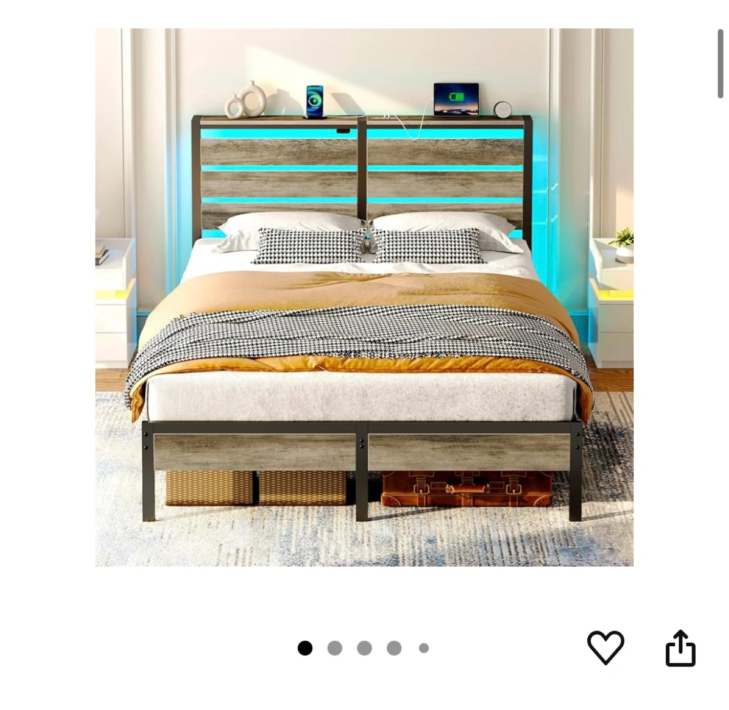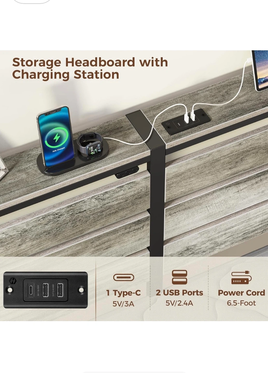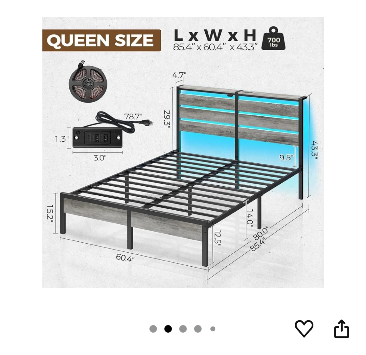 Selling a brand new Queen size bed frame, still in its original packaging! This bed frame features a storage headboard with a built-in charging station, including 1 Type-C (5V/3A) and 2 USB ports (5V/2.4A), plus a 6.5-foot power cord. The headboard also has cool LED lighting. Dimensions are 85.4" x 60.4" x 43.3".