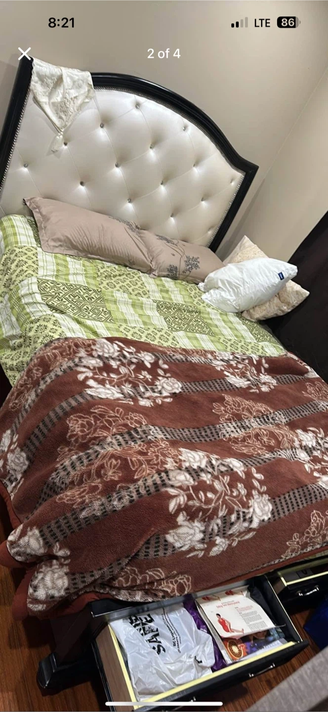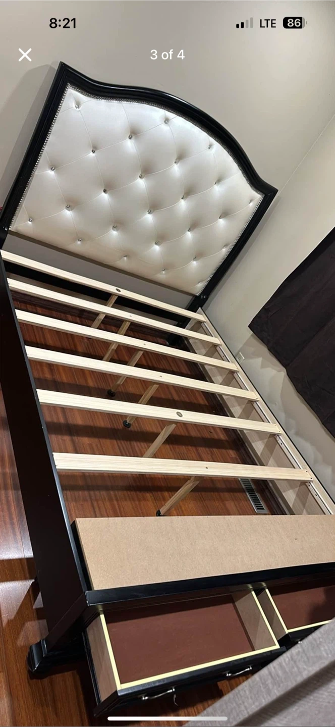 15Selling a bed frame with an upholstered headboard. The frame is black with a cream-coloured, tufted headboard. It also includes built-in storage drawers at the foot of the bed. Perfect for adding a touch of elegance and functionality to your bedroom!