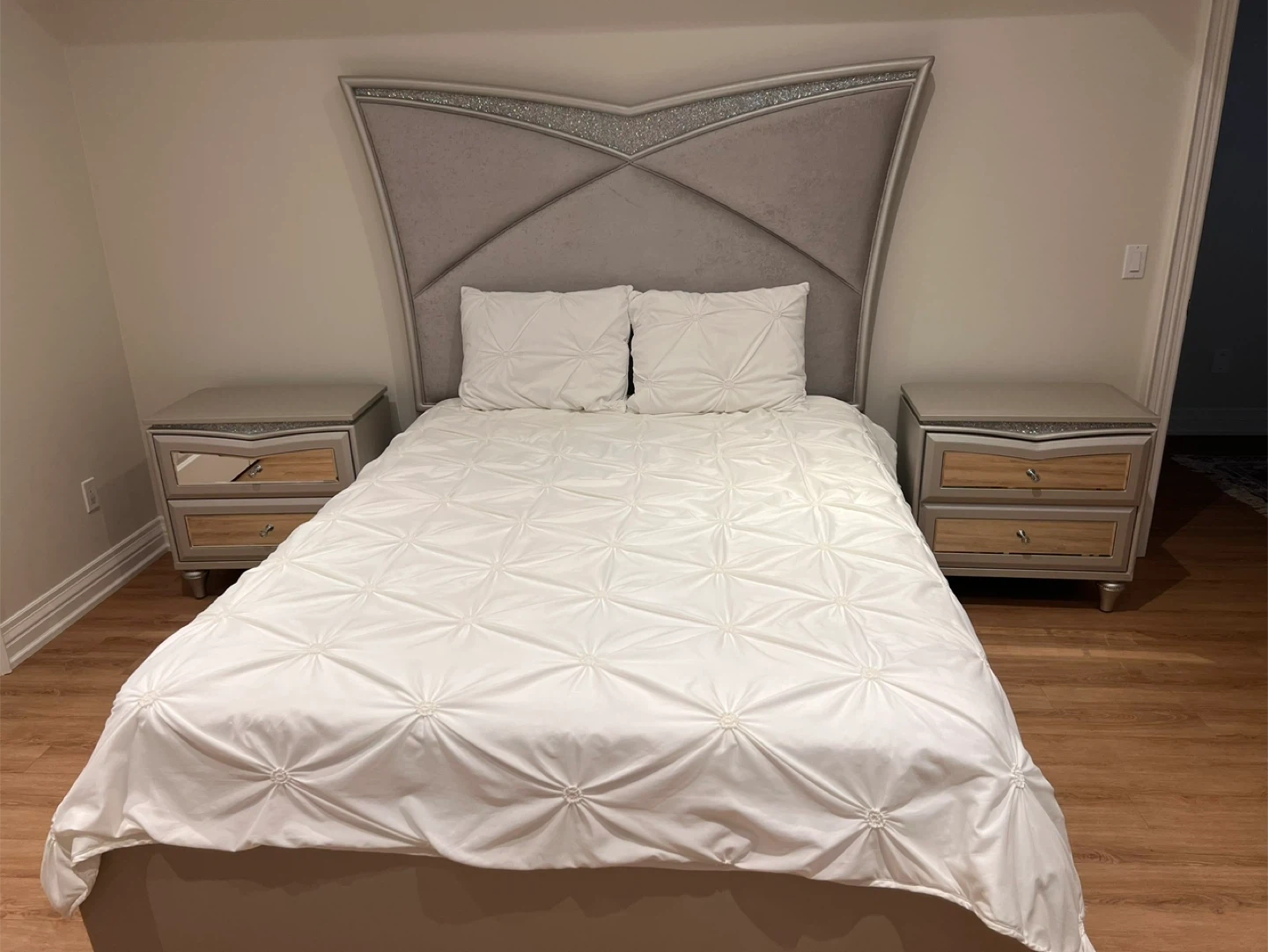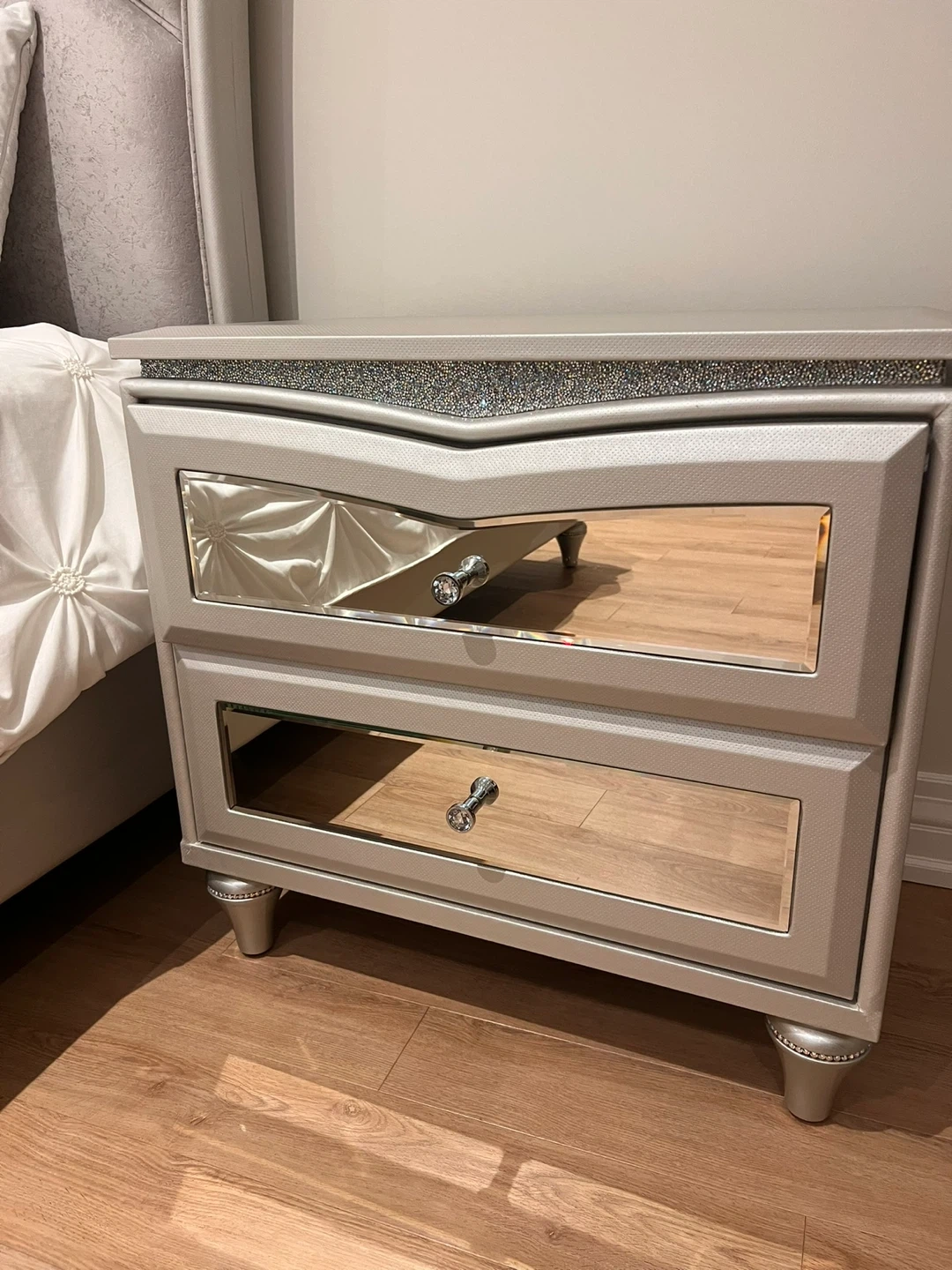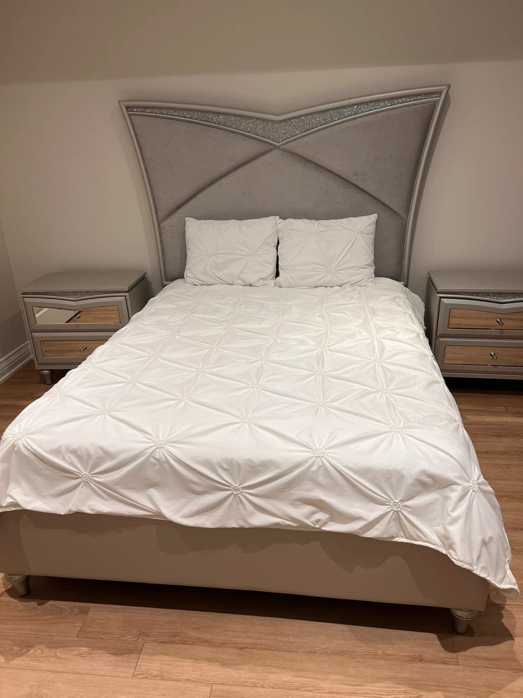 10Selling a queen size bed frame with two matching nightstands. The set is brand new and features a stylish silver finish with mirrored accents. The nightstands have two drawers each, providing ample storage. This bed frame would be a great addition to any bedroom! It’s a designer bed.