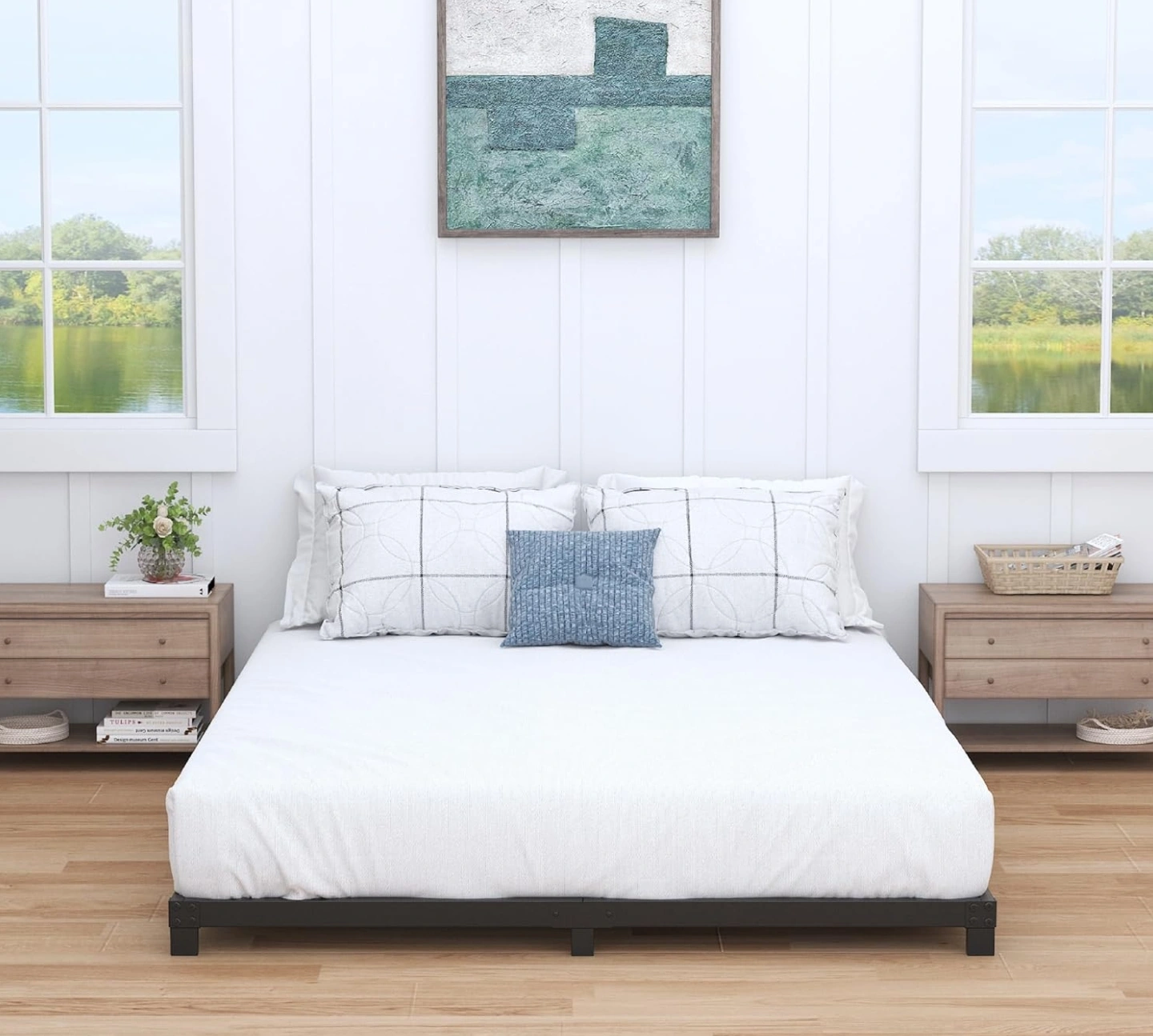 Looking to upgrade your bedroom? I'm selling a queen-size metal bed frame in black! It's designed to be squeak resistant for a peaceful sleep. The frame is sturdy and stable, constructed with reliable slats, side rails, and 9 reinforced legs, supporting up to 3000 lbs. It's a low-profile bed frame, perfect if you prefer sleeping closer to the floor. The dimensions are 79.5"L x 59.5"W x 4"H. Easy to assemble with the included installation manual!