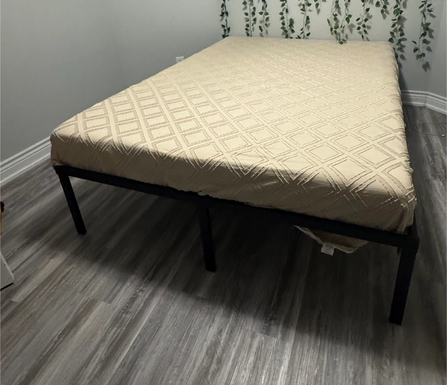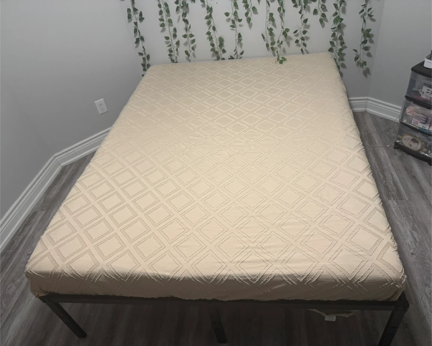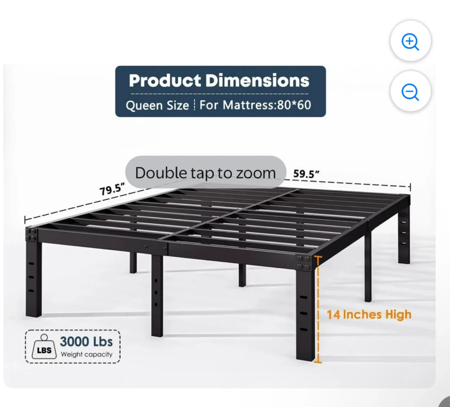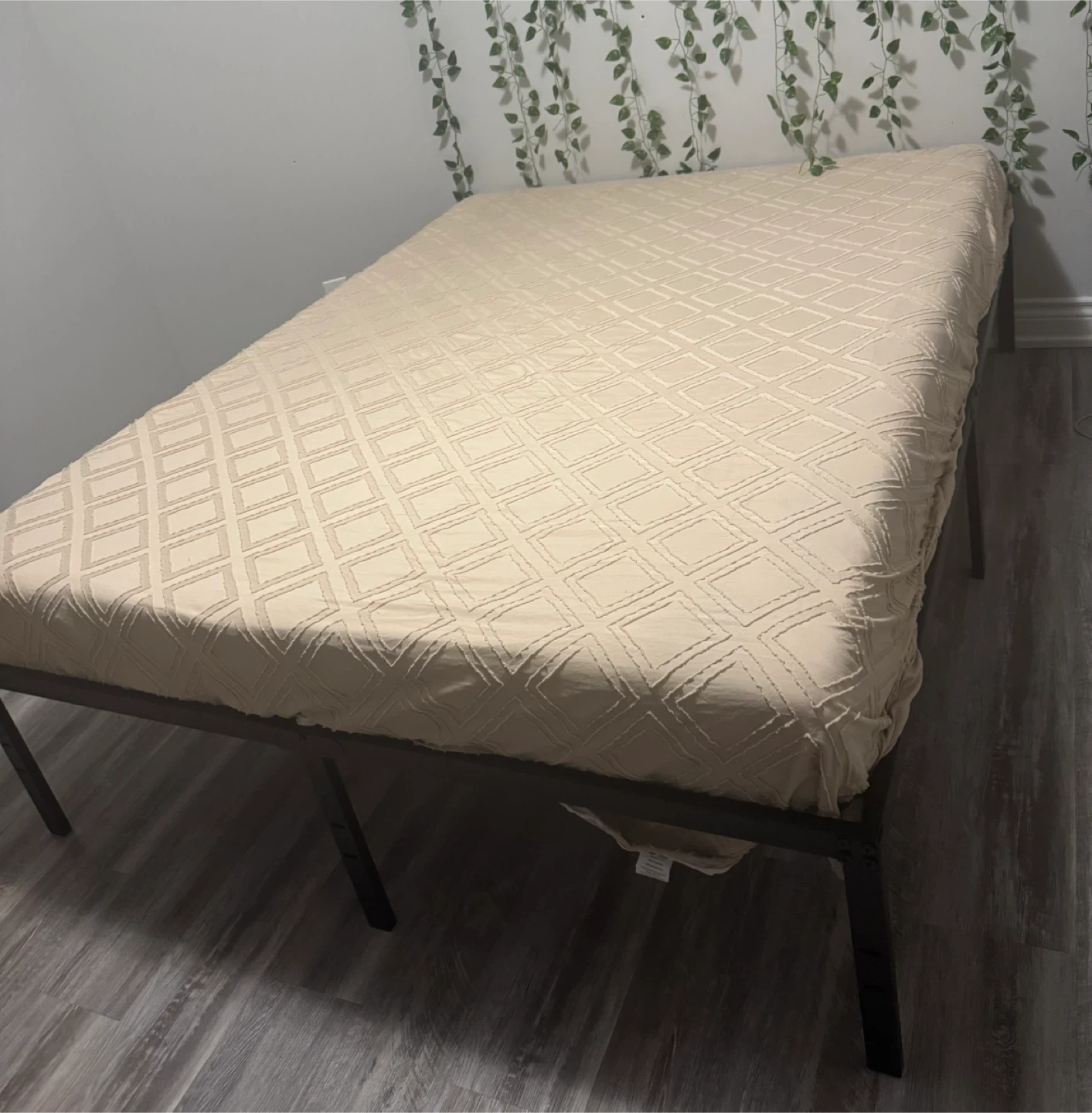 10Selling a queen size metal bed frame in great condition! It has 14 inches of under-bed storage space. The dimensions are 79.5" x 59.5". It supports up to 3000 lbs. Also a queen size mattress ( brand name Bloom river) . l bought it from sleep country . lt is in good condition.