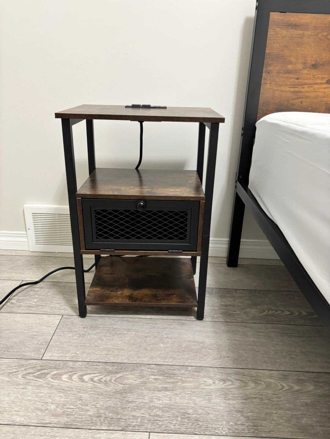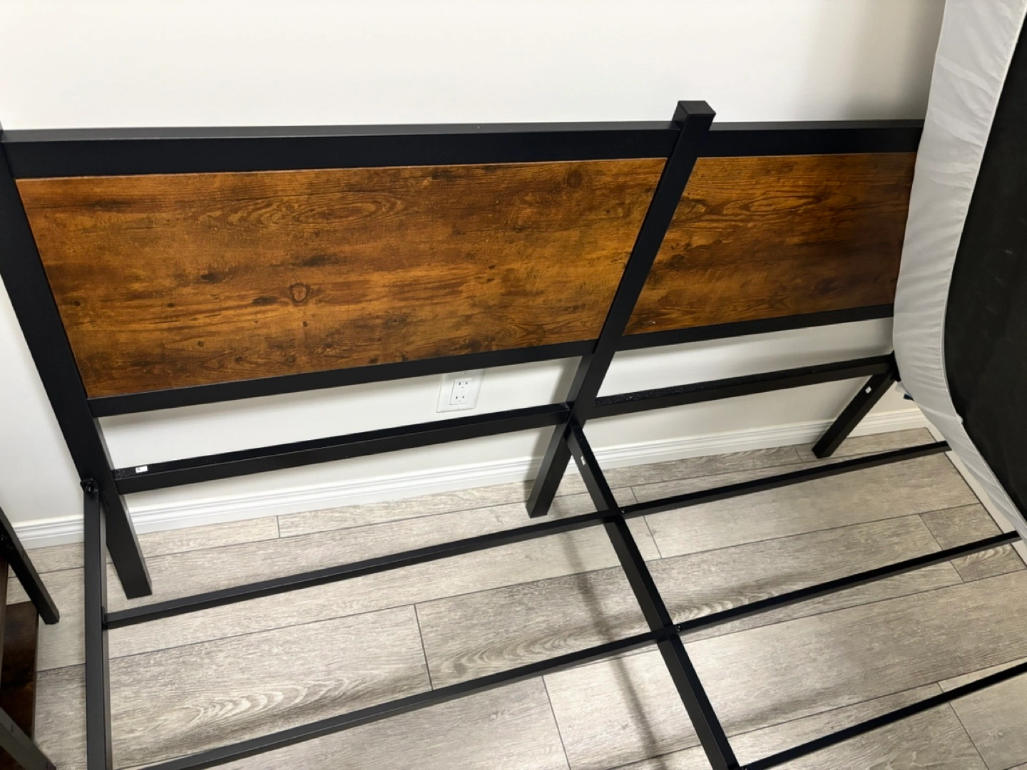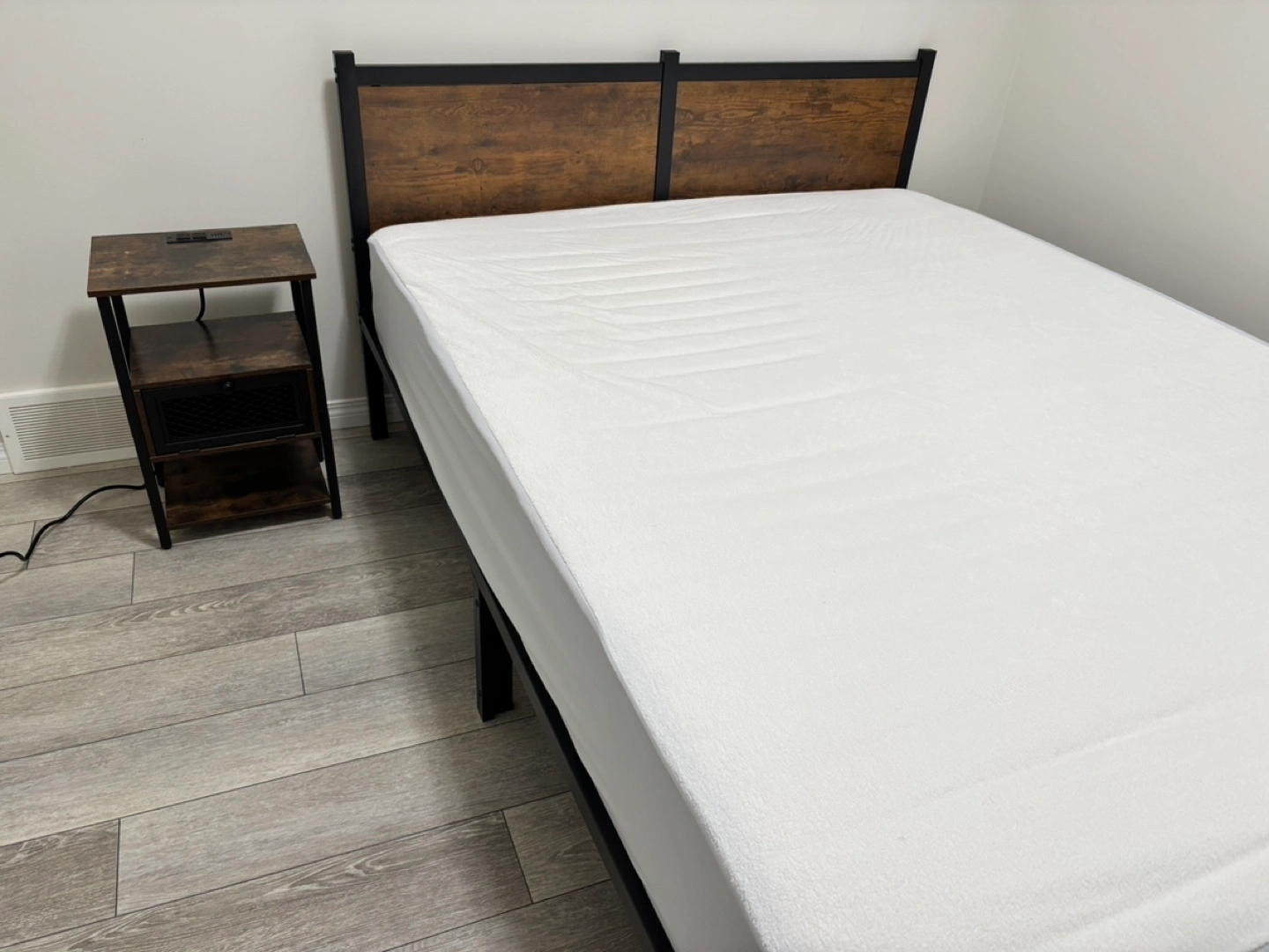 15Metal bed frame, queen size, brown wood-look headboard. Matching nightstand included plus queen size mattress. Features a small drawer and shelf. Minimal assembly required. New like condition, bought just 6 months ago. Need to upsize All 3 items go together. Queen size bed - made of Engineered Wood 197L x 103W x 92H, no box needed Queen size mattress - 10 Inch Cooling-Gel Memory Foam and Pocket Spring Hybrid Mattress, CertiPUR-US Certified, Medium Firm 60inch L X 80inch W Night stand - 30D x 40W x 60H Centimetres, Metal and Wood with Charging Station
