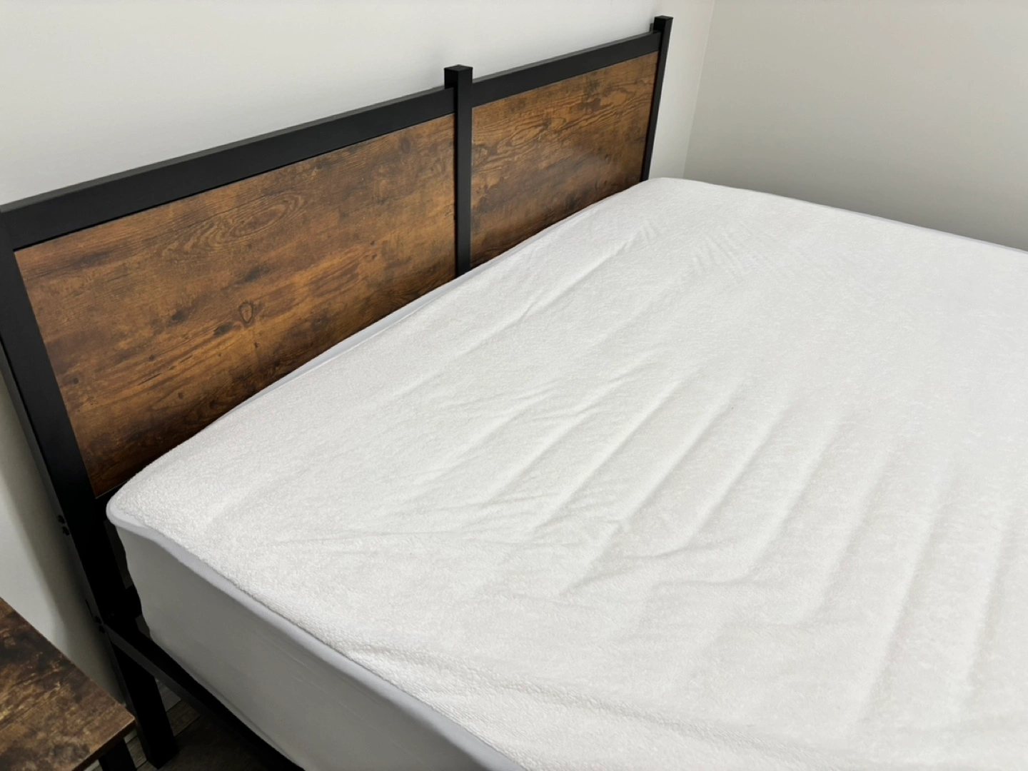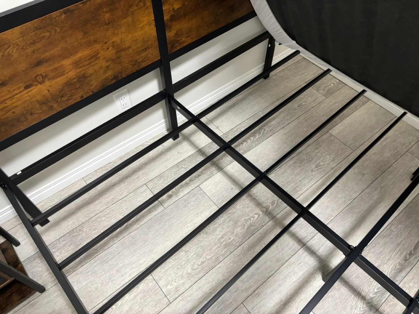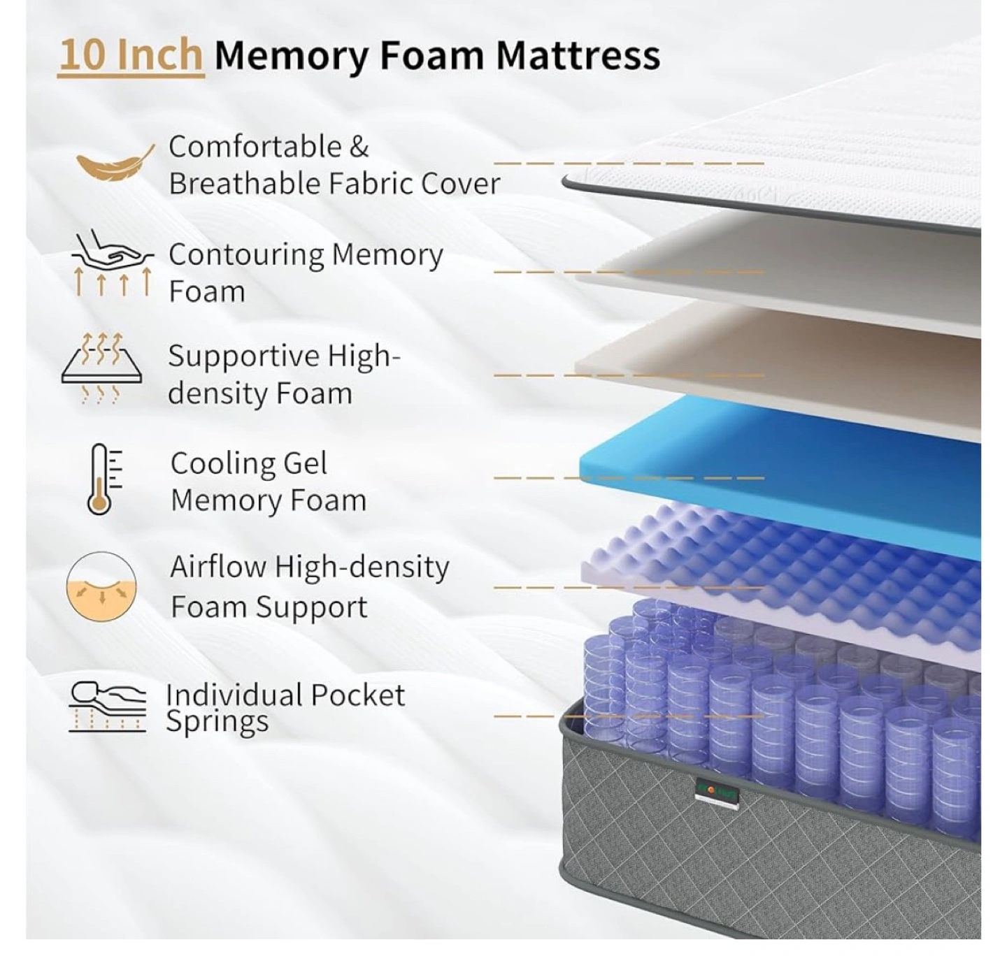 15Metal bed frame, queen size, brown wood-look headboard. Matching nightstand included plus queen size mattress. Features a small drawer and shelf. Minimal assembly required. New like condition, bought just 6 months ago. Need to upsize All 3 items go together. Queen size bed - made of Engineered Wood 197L x 103W x 92H, no box needed Queen size mattress - 10 Inch Cooling-Gel Memory Foam and Pocket Spring Hybrid Mattress, CertiPUR-US Certified, Medium Firm 60inch L X 80inch W Night stand - 30D x 40W x 60H Centimetres, Metal and Wood with Charging Station