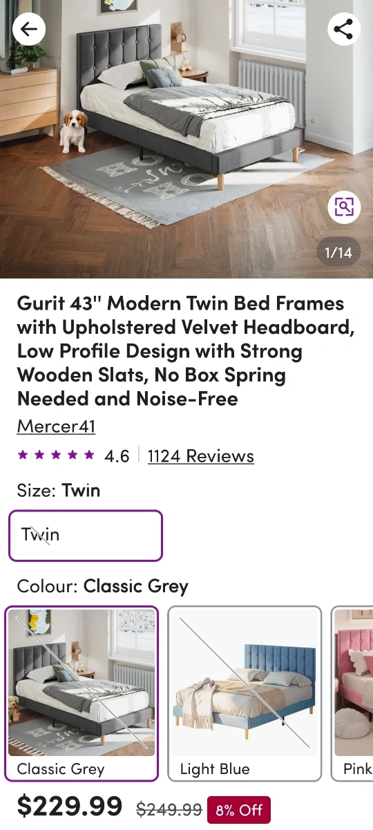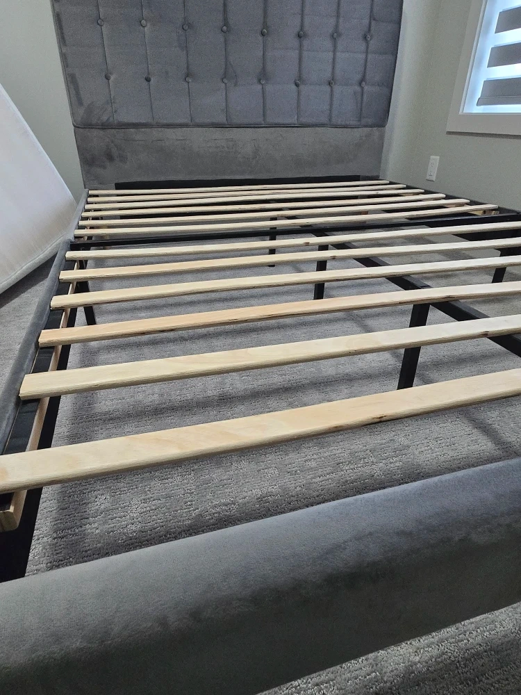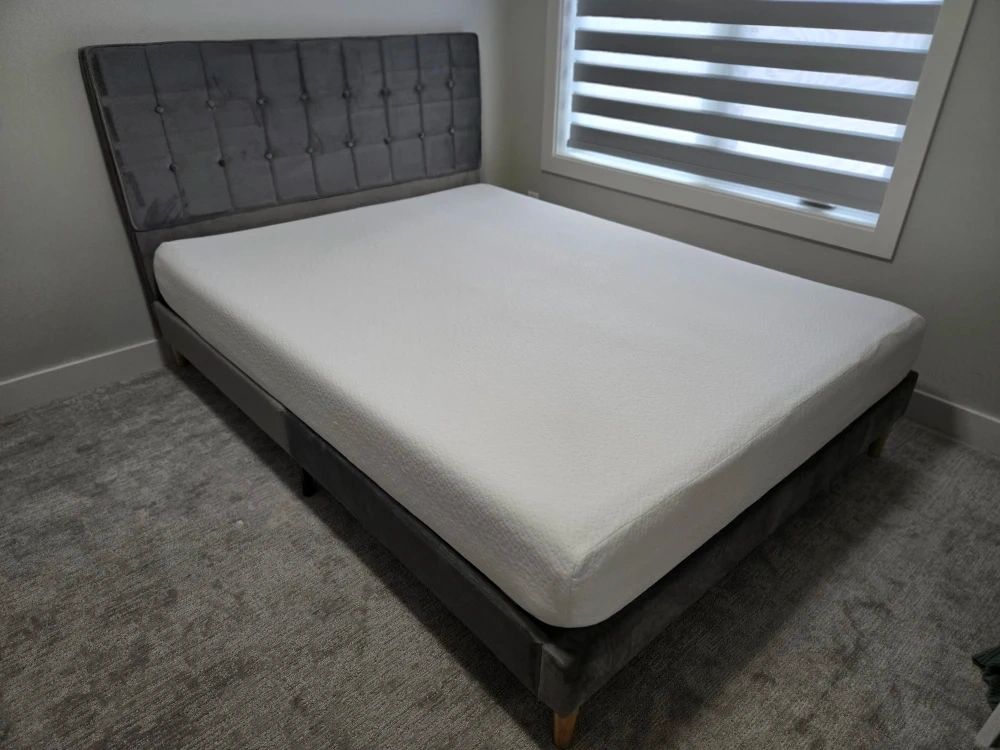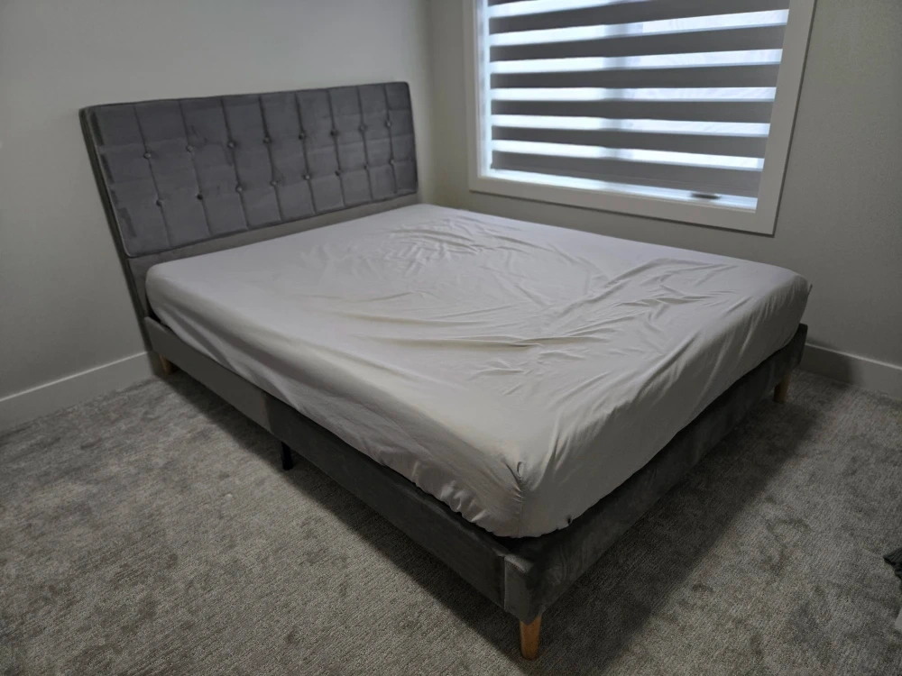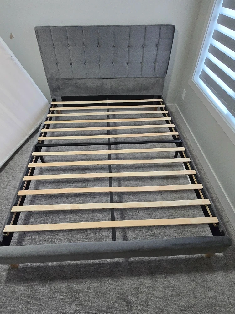 37Selling mattress together. Selling a stylish grey upholstered platform bed. The bed features a button-tufted headboard and a sturdy platform base. It's made with quality materials, including polyurethane foam, viscoelastic polyurethane, and a polyester/elastane cover. Perfect for adding a touch of elegance to your bedroom! Last picture shown in Twin size, mine is a Queen size. Originally purchased from Wayfair. Used in guest room. Bed frame is in perfect condition. Mattress has a little stain. Always use it with waterproof mattress cover. *please check my other active listing.