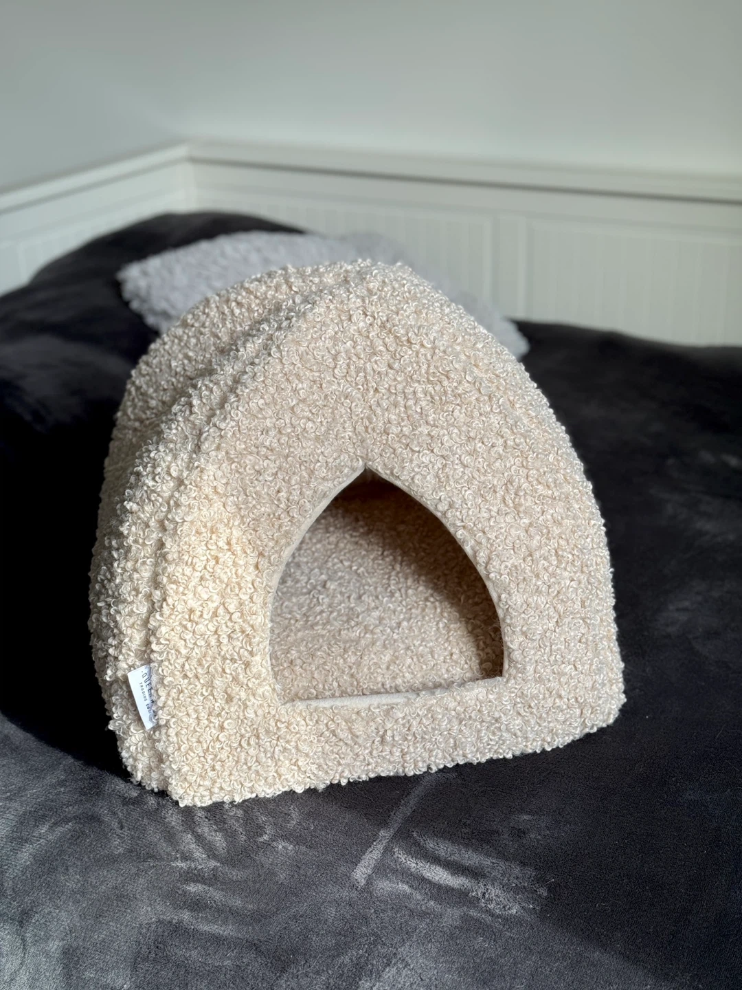 Bought it at Winners for $25+ taxes but my cat denied it :( This cozy pet cave bed from Queen West Trading Co. is perfect for your furry friend! It's made of a soft, cream-coloured, sherpa-like material, which is 100% polyester. It's in great condition and ready for a new home! Size: 15 x 15 x 15 inches (38 x 38 x 38 cm)