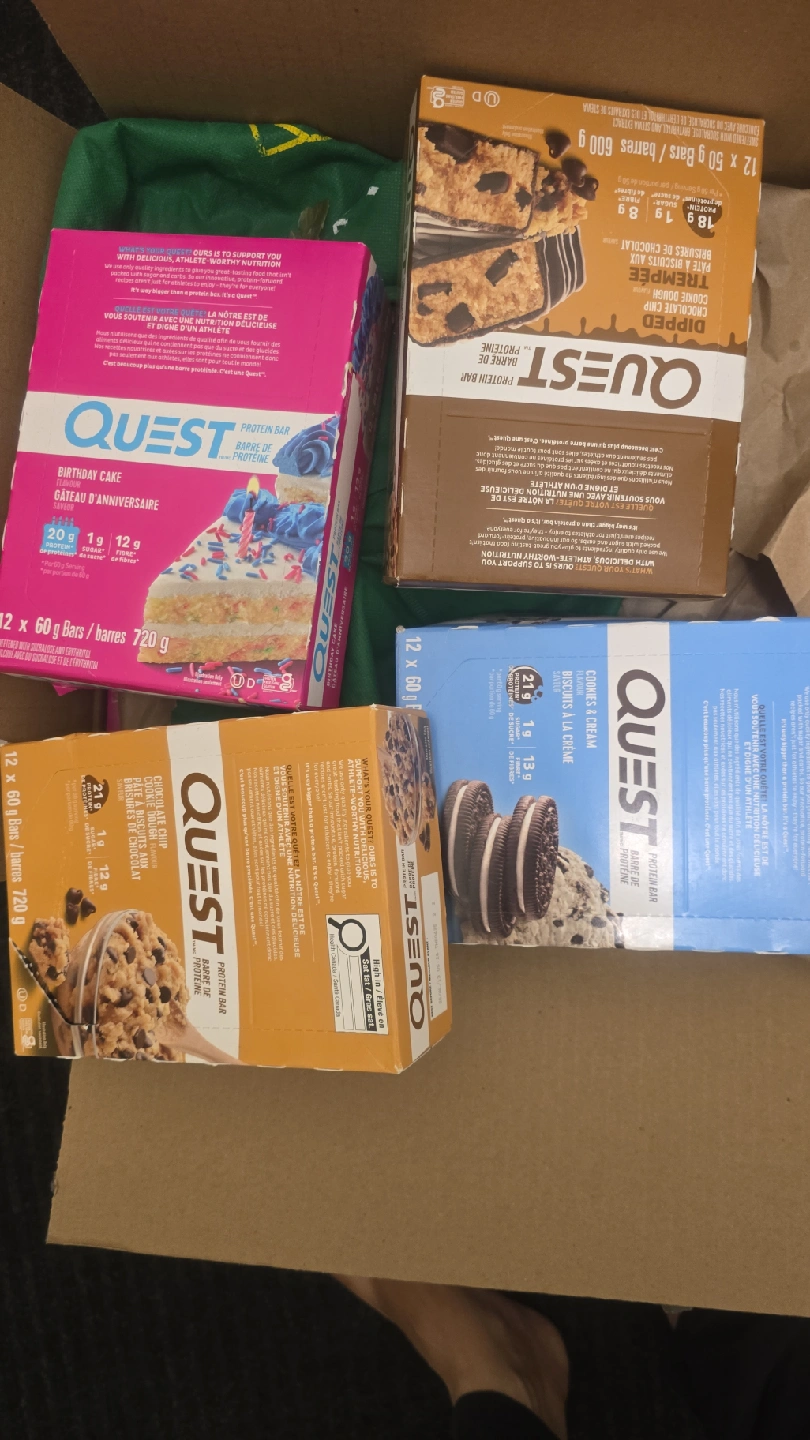 Got a variety pack of Quest protein bars up for grabs! Flavours include Birthday Cake, Chocolate Chip Cookie Dough, Cookies & Cream, and Dipped Chocolate Chip Cookie Dough. Each box contains 12 bars. Perfect for a quick and healthy snack!