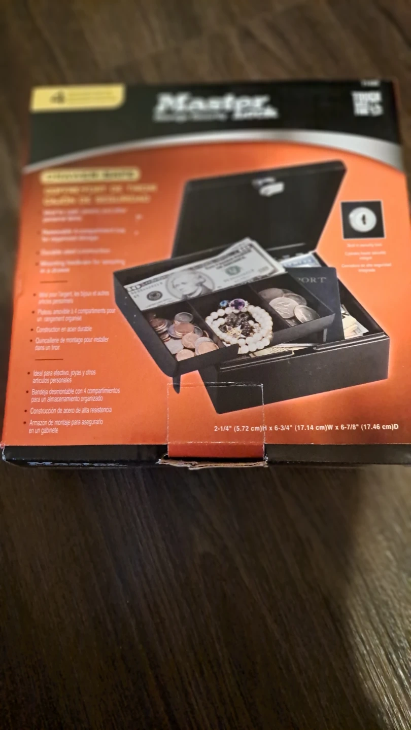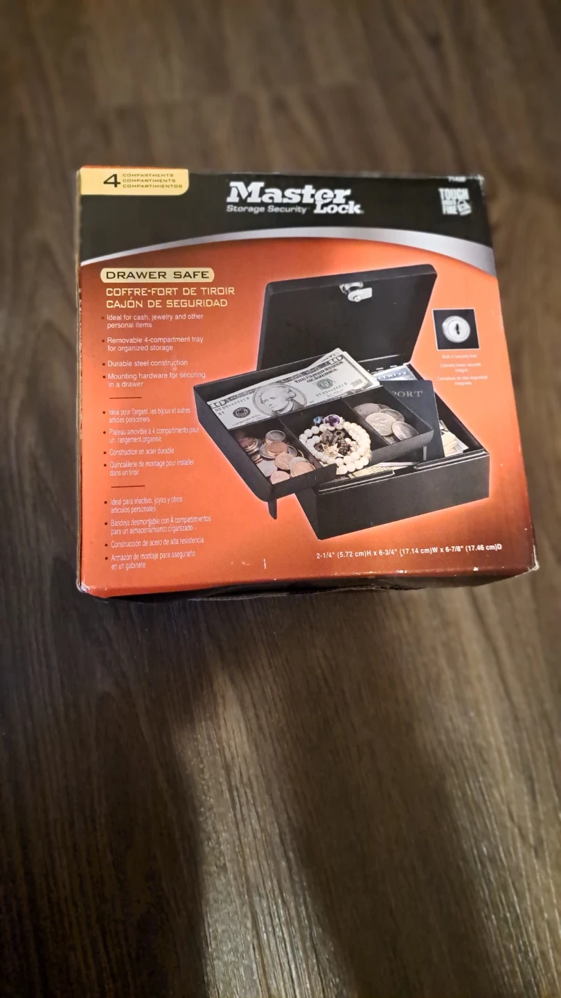 Master drawer safe for cash, jewelry, and other small items. Features a removable 4-compartment tray and durable steel construction. It includes mounting hardware for securing it in a drawer. Dimensions: 2-1/4" H x 6-3/4" W x 6-7/8" D.