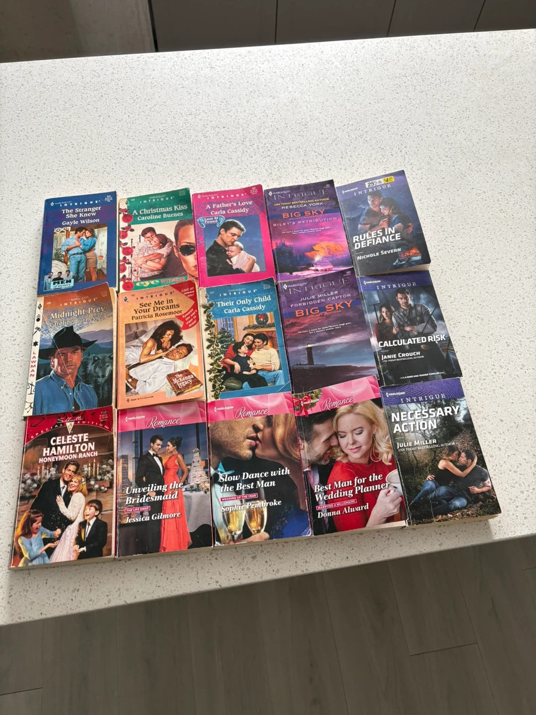 This is a collection of Harlequin romance and intrigue novels. Titles include 'The Stranger She Knew', 'A Christmas Kiss', 'A Father's Love', 'Big Sky', 'Rules in Defiance', 'Midnight Prey', 'See Me in Your Dreams', 'Their Only Child', 'Forbidden Captor', 'Calculated Risk', 'Celeste Hamilton Honeymoon Ranch', 'Unveiling the Bridesmaid', 'Slow Dance with the Best Man', 'Best Man for the Wedding Planner', and 'Necessary Action'. Great for avid readers of the genre!