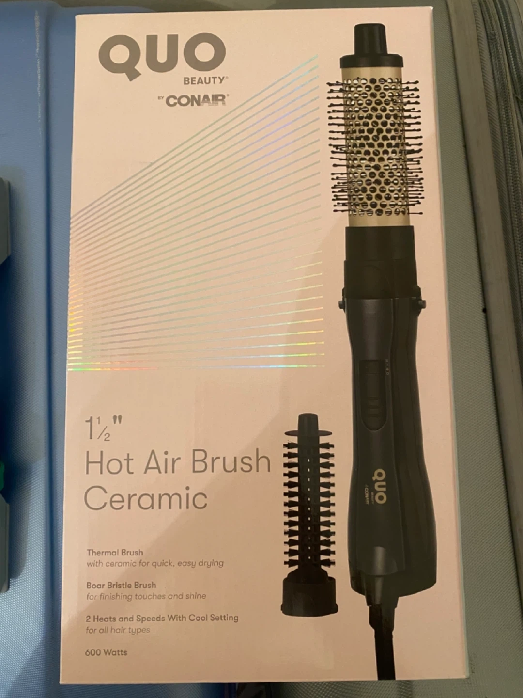 10I'm selling a QUO Beauty by Conair 1 1/2" Hot Air Brush. It's a ceramic thermal brush designed for quick, easy drying. It also features a boar bristle brush for finishing touches and shine, and has 2 heat and speed settings with a cool setting for all hair types. It operates at 600 Watts. Used for one month only.