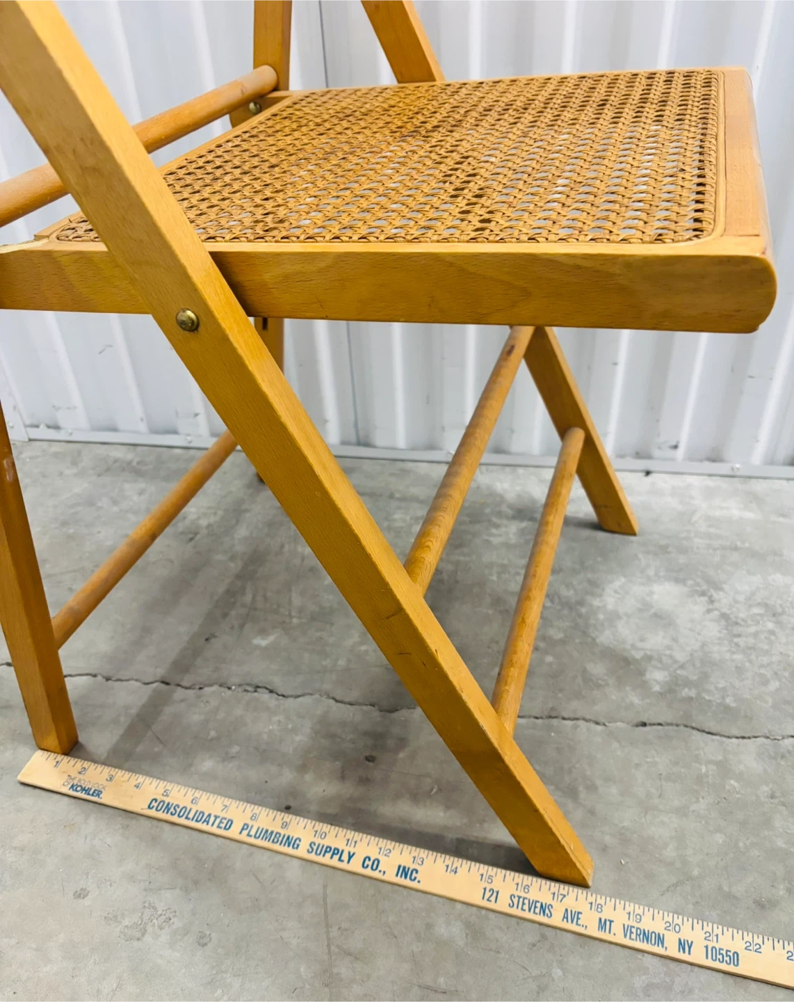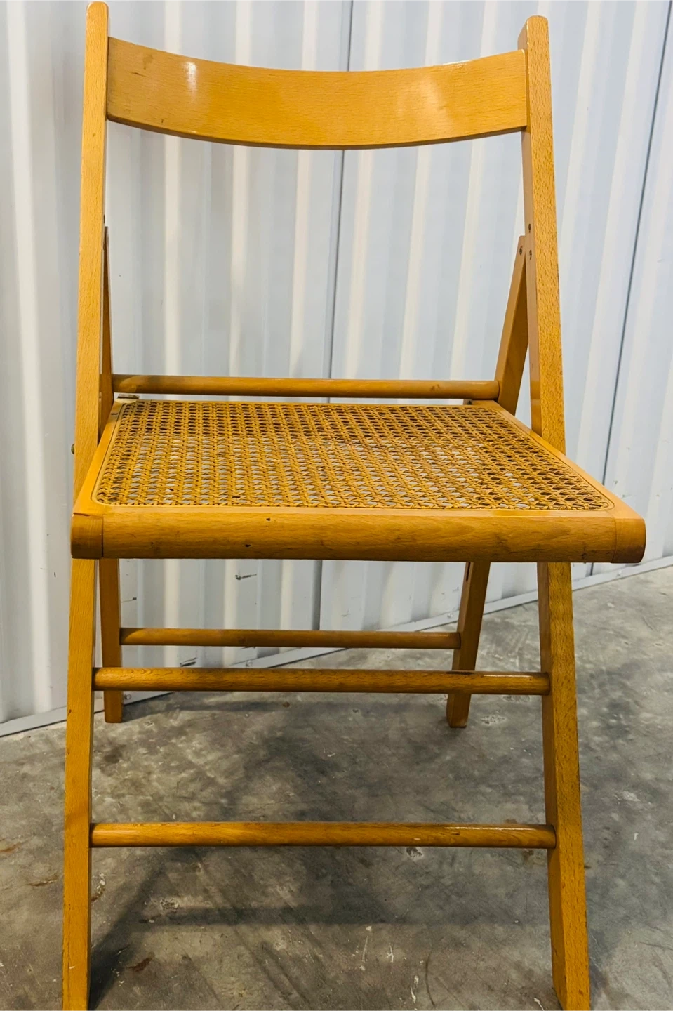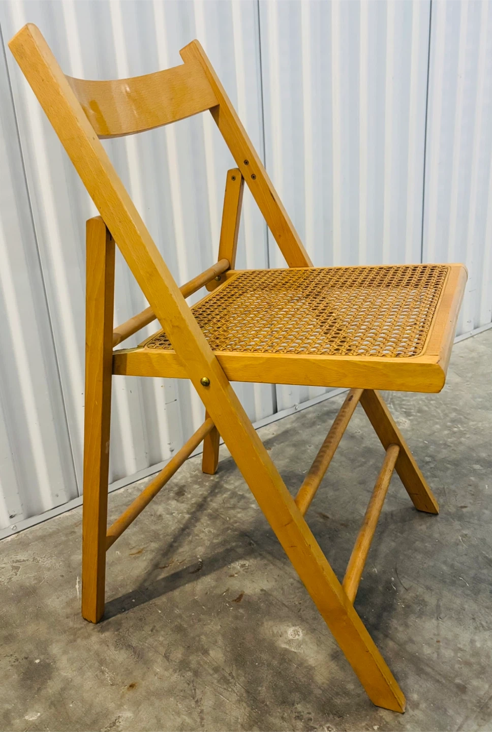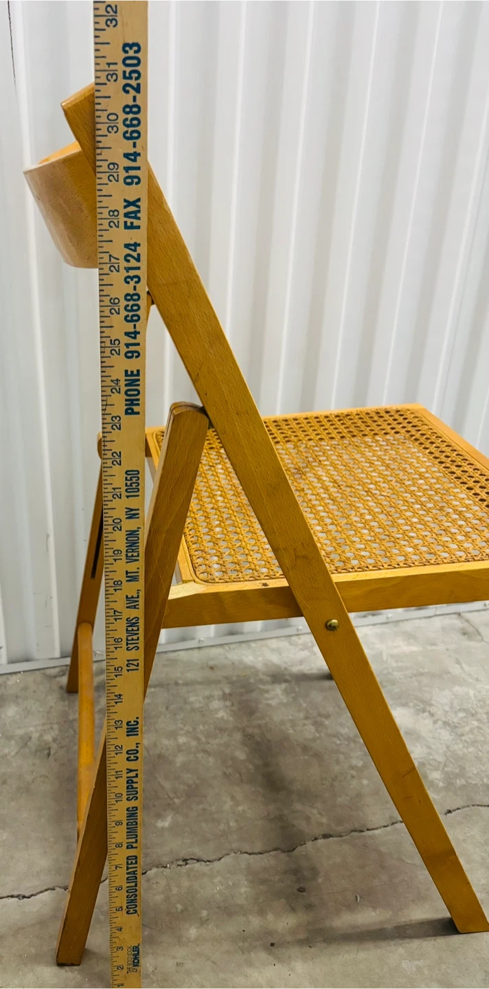 This is a beech wooden folding chair, made in Italy, featuring a woven cane seat. It's a versatile piece that can be easily stored away. Chair folds for convenient storage.