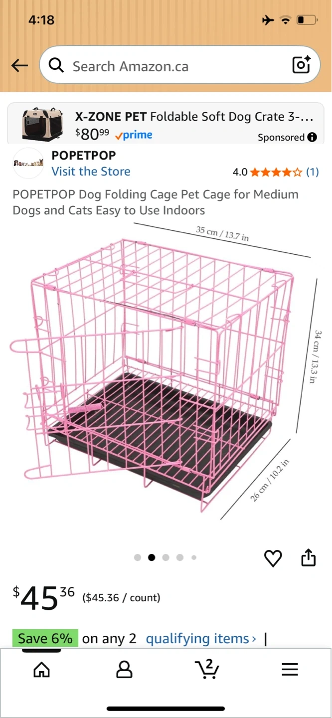This is a POPETPOP dog folding cage. It's pink and comes with a black tray. Dimensions are 35 cm x 26 cm x 34 cm.