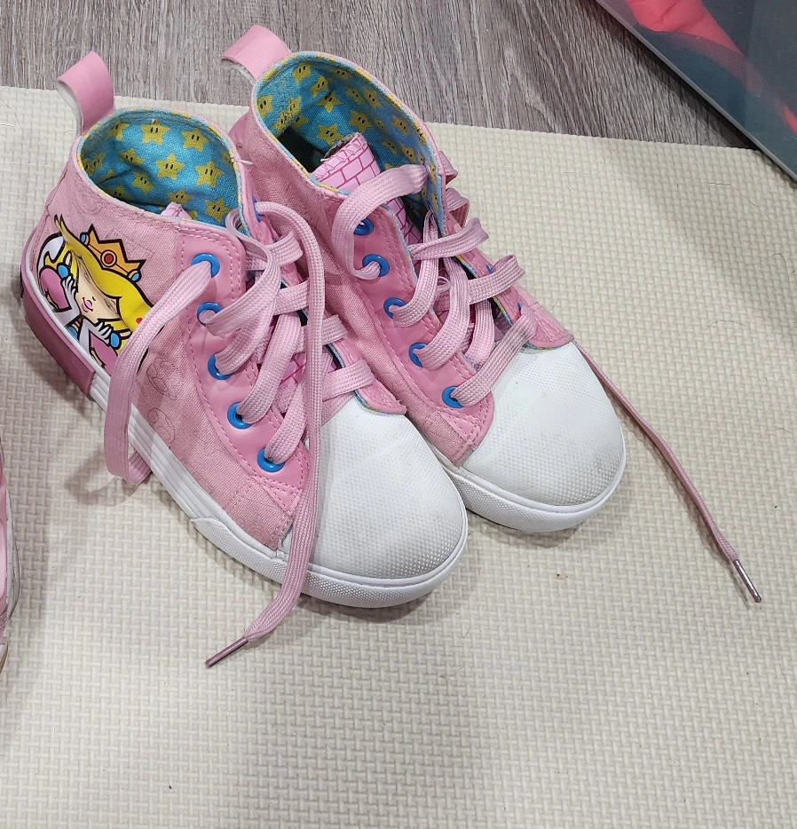 These cute pink high-top sneakers feature Princess Peach from Super Mario! They're perfect for any fan of the game. They have laces and a canvas toe cap. Size 1.