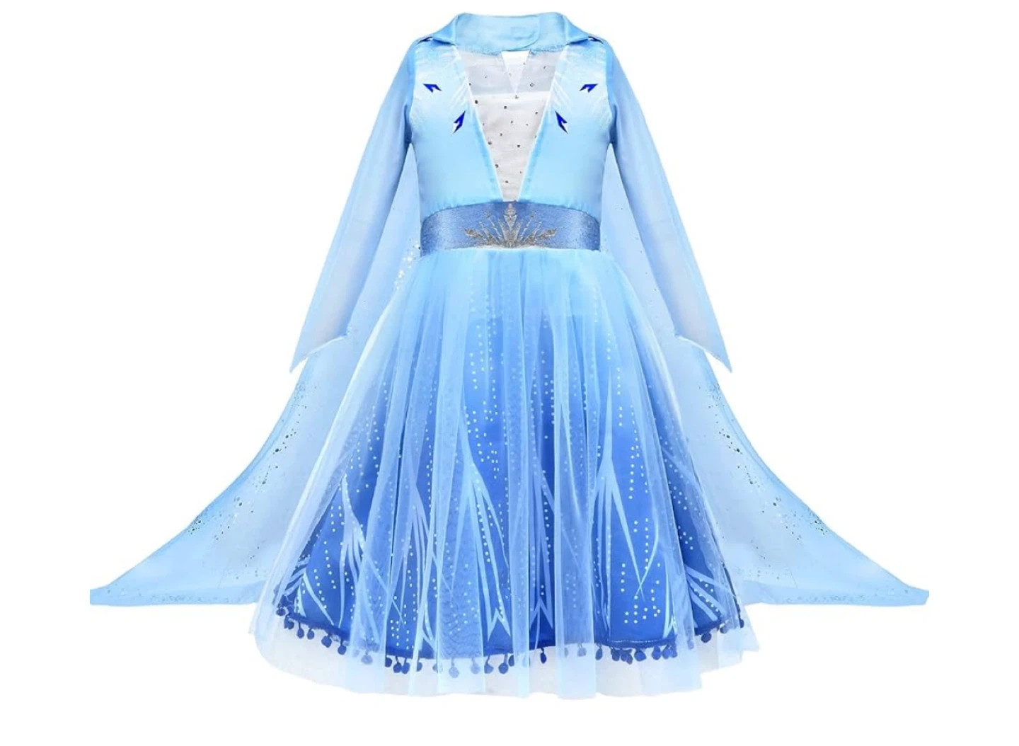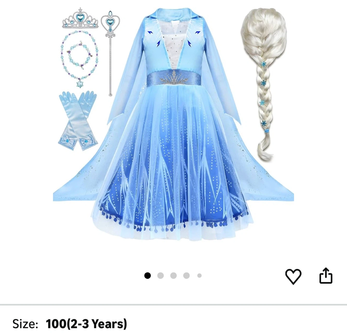 A beautiful blue Elsa-inspired dress, perfect for dress-up or parties. It includes a tiara, wand, necklace, bracelet, gloves, and a wig. Size 100 (2-3 Years).