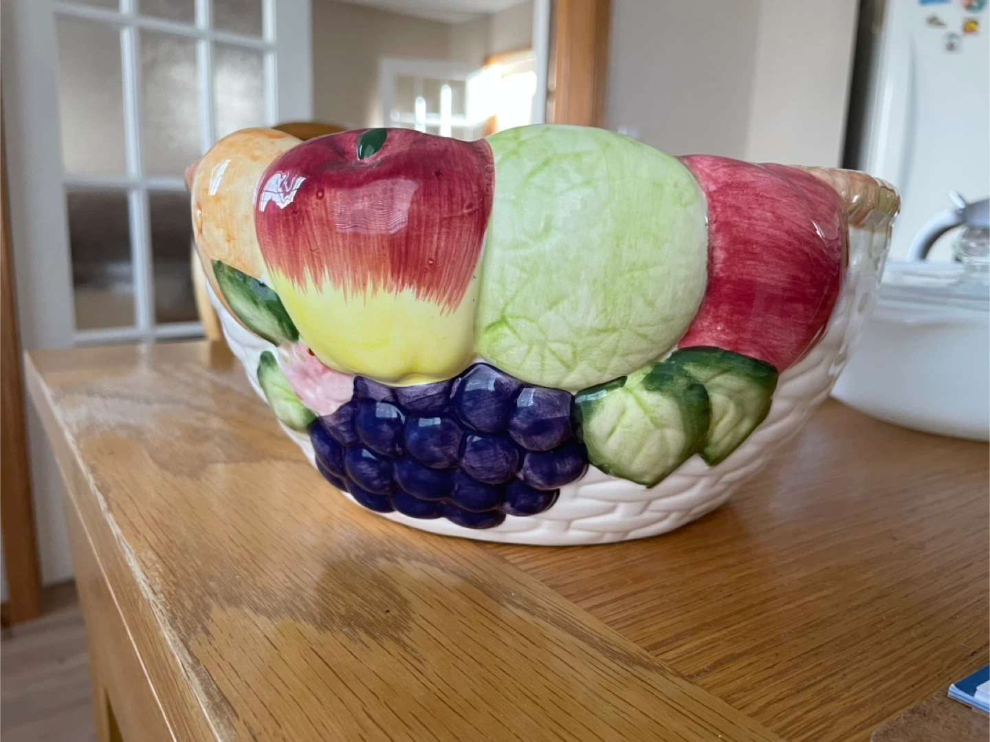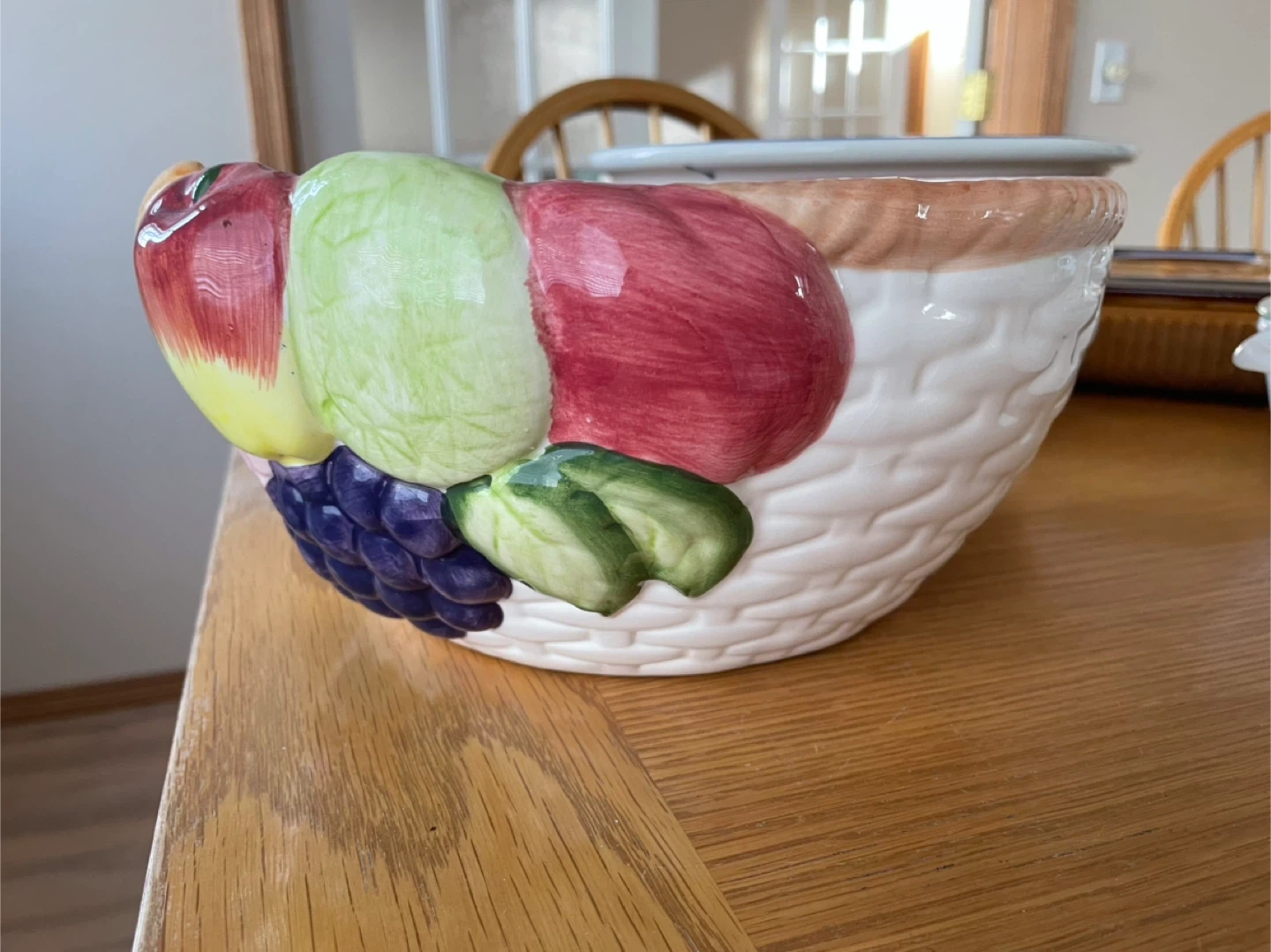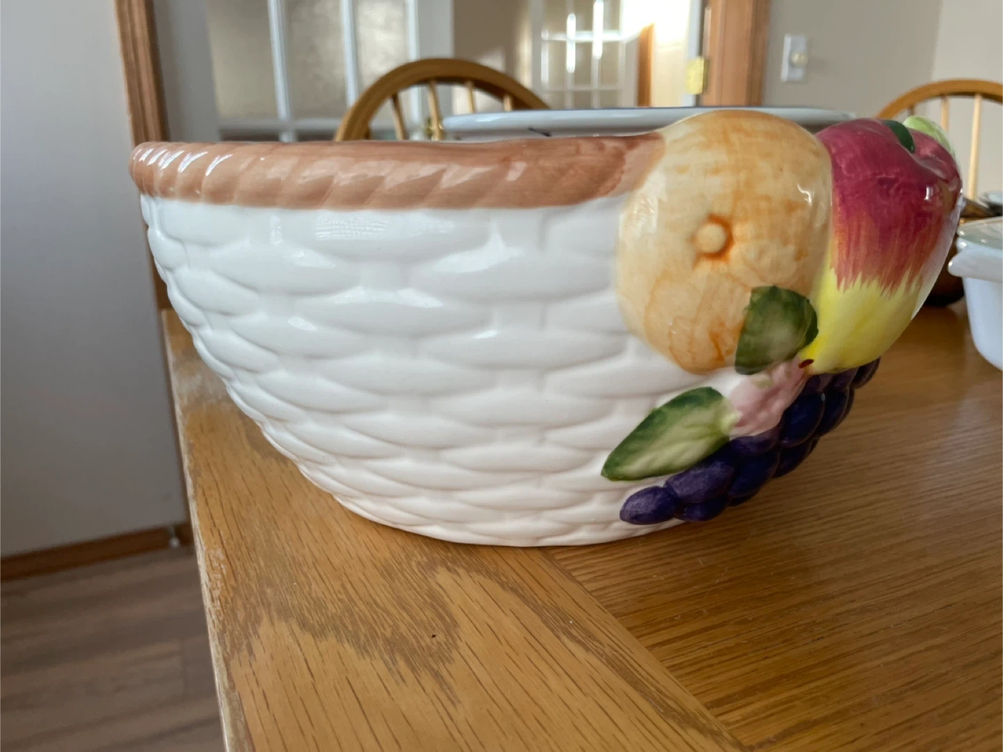 Ceramic fruit basket bowl with a woven pattern and colourful fruit decorations. It's a lovely decorative piece for any kitchen counter. Great for holding fruit or other items!