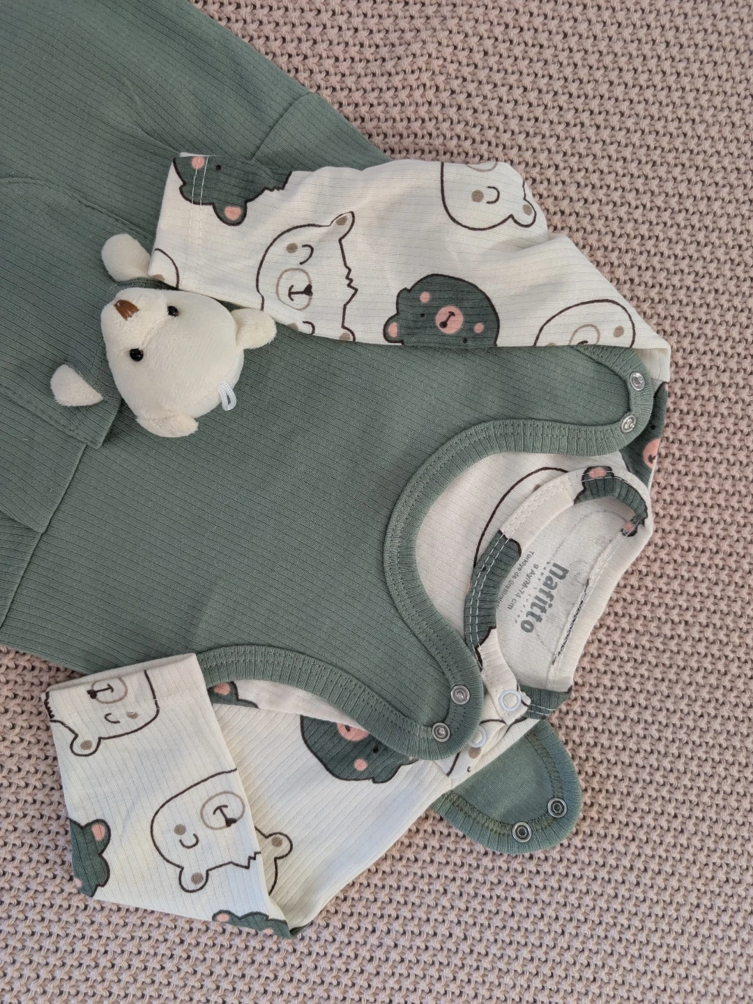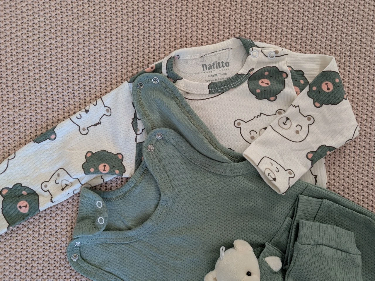 Adorable Nafitto baby set featuring a sage green ribbed romper with a stuffed bear detail and a matching long-sleeve bodysuit with a cute bear print. The set includes a bodysuit and overalls.